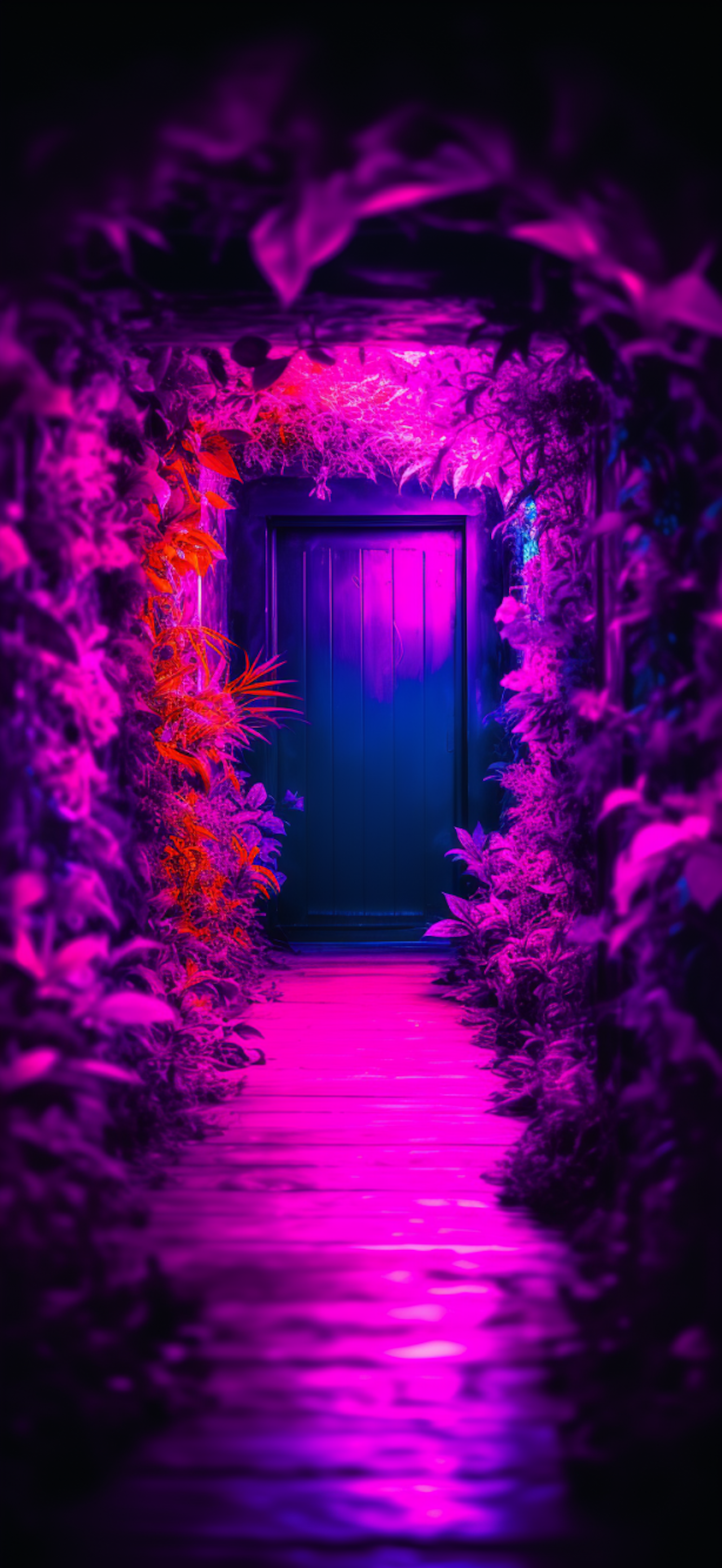 A mystical corridor with vibrant pink and purple lighting, lush foliage, and a deep blue door at the end, creating an enchanting atmosphere.