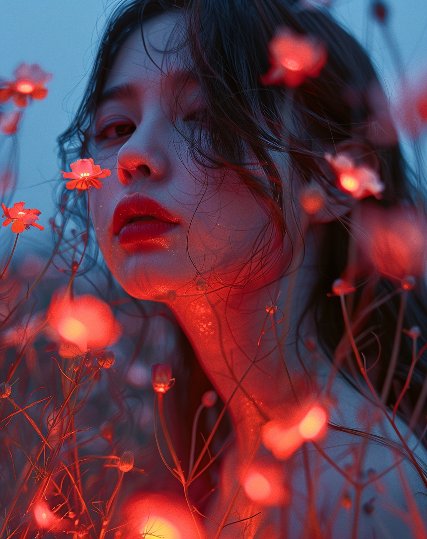 A serene portrait of a woman surrounded by glowing red flowers against a cool blue background, creating a mystical and dreamy atmosphere.