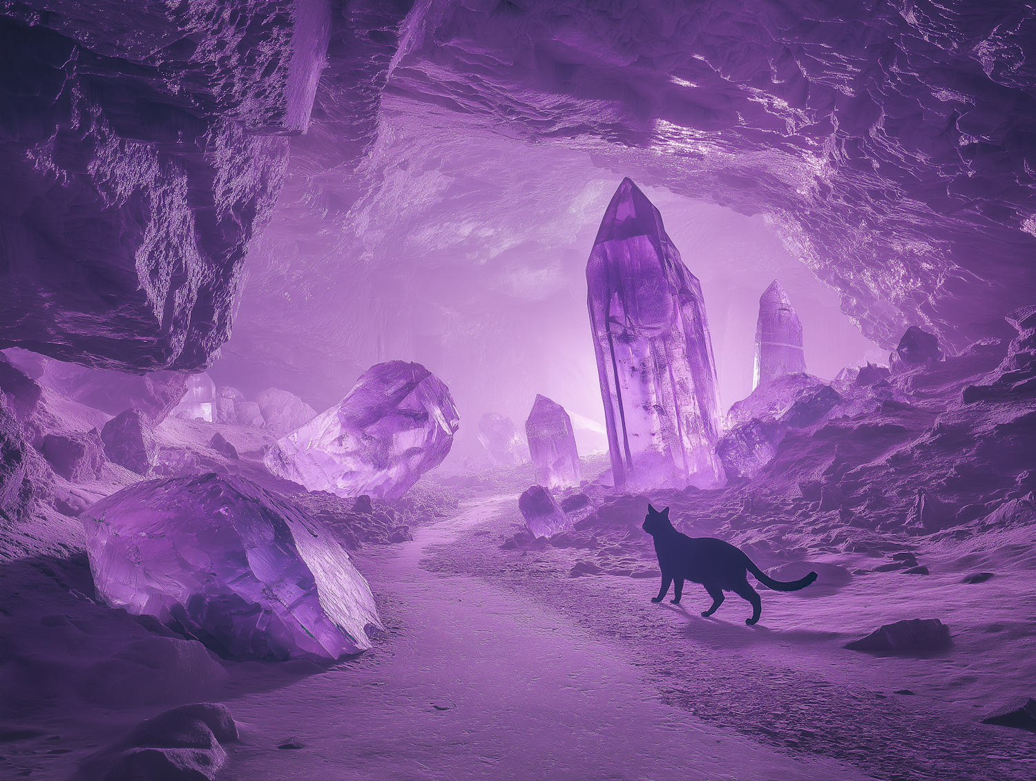 A mystical cave with glowing amethyst crystals and a black cat exploring the enchanting purple-lit landscape.