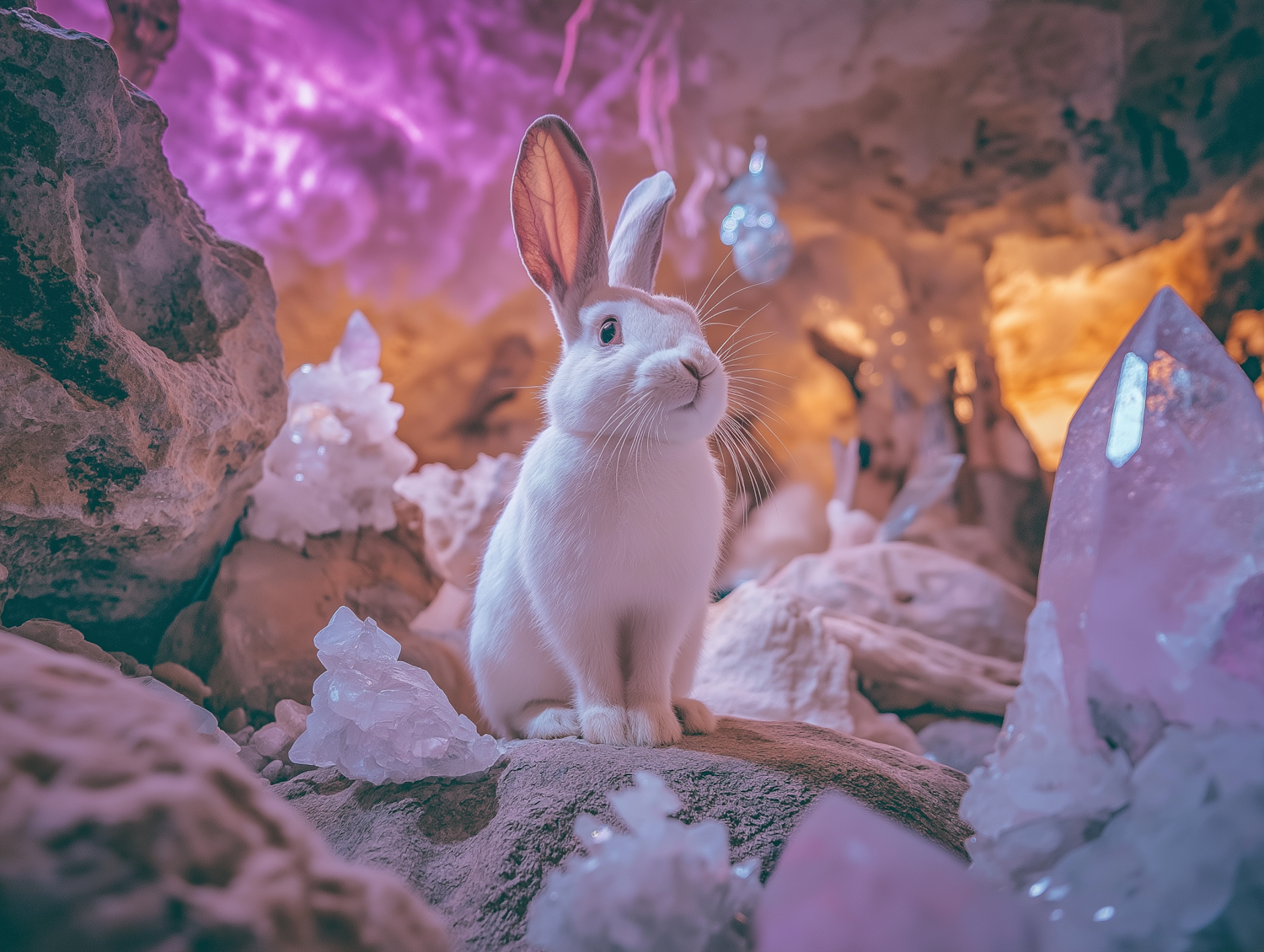 A white rabbit sits among sparkling crystals in a mystical cave, illuminated by soft purple and orange lighting.