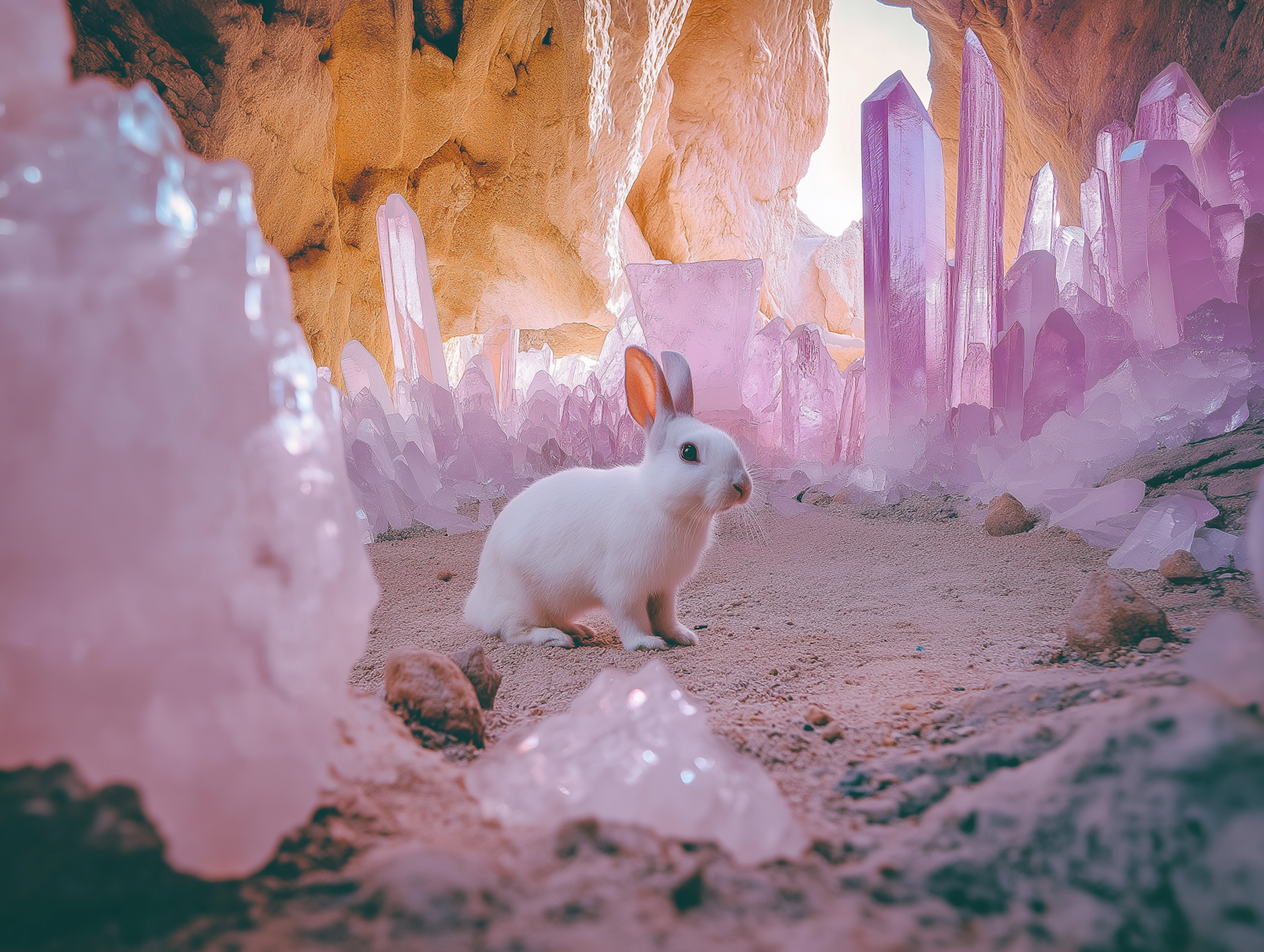 A white rabbit in a cave surrounded by large pink crystals, creating a magical and enchanting atmosphere.