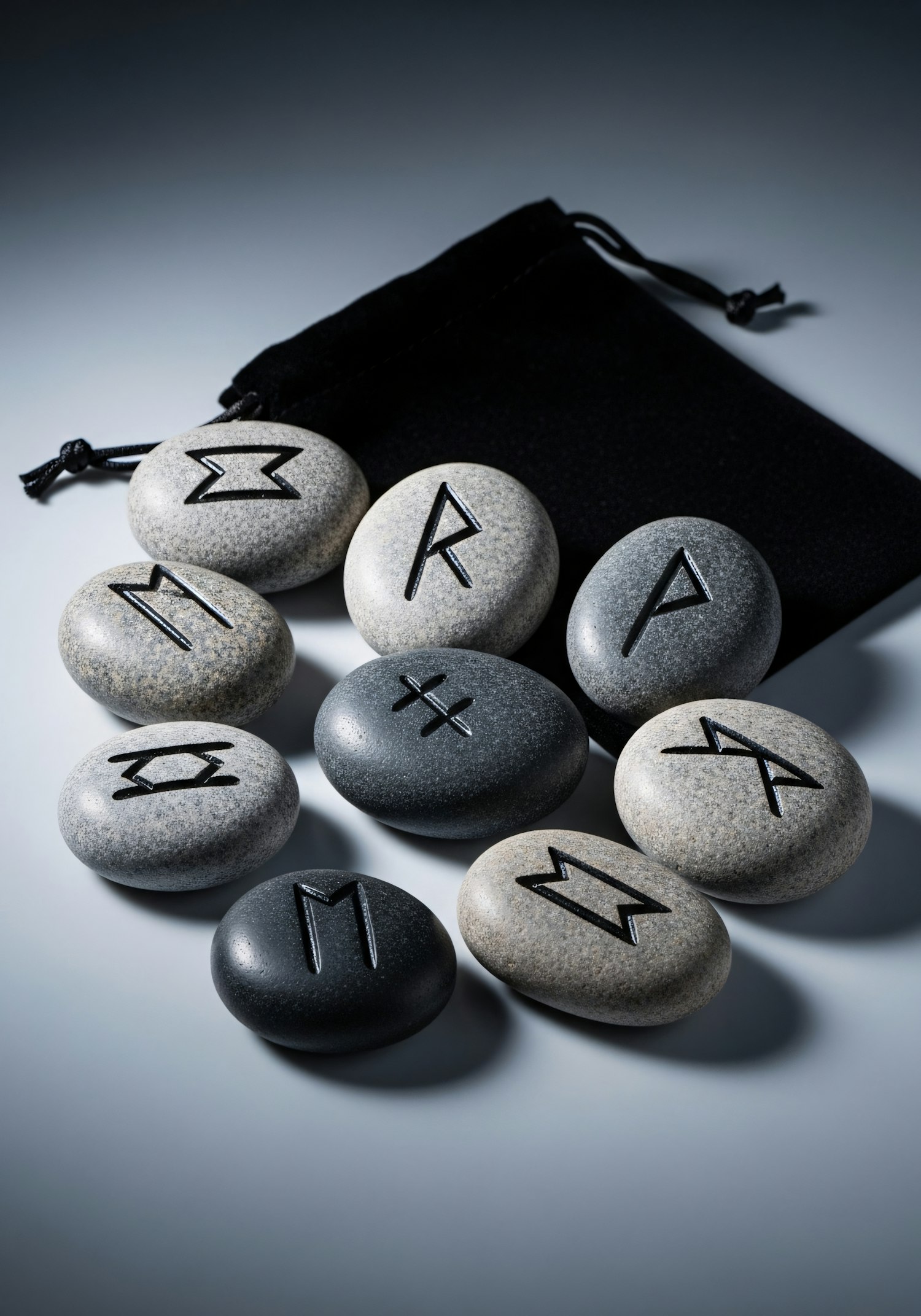 A set of polished rune stones with engraved symbols, accompanied by a black pouch, arranged on a smooth surface under dramatic lighting.