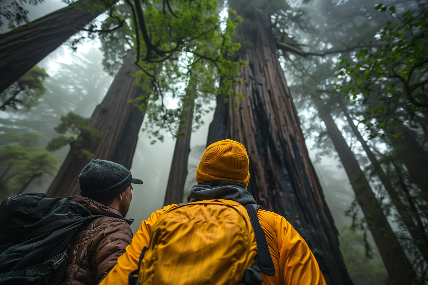 Two hikers in a misty redwood forest, wearing yellow and dark jackets, gaze up at towering trees enveloped in fog.