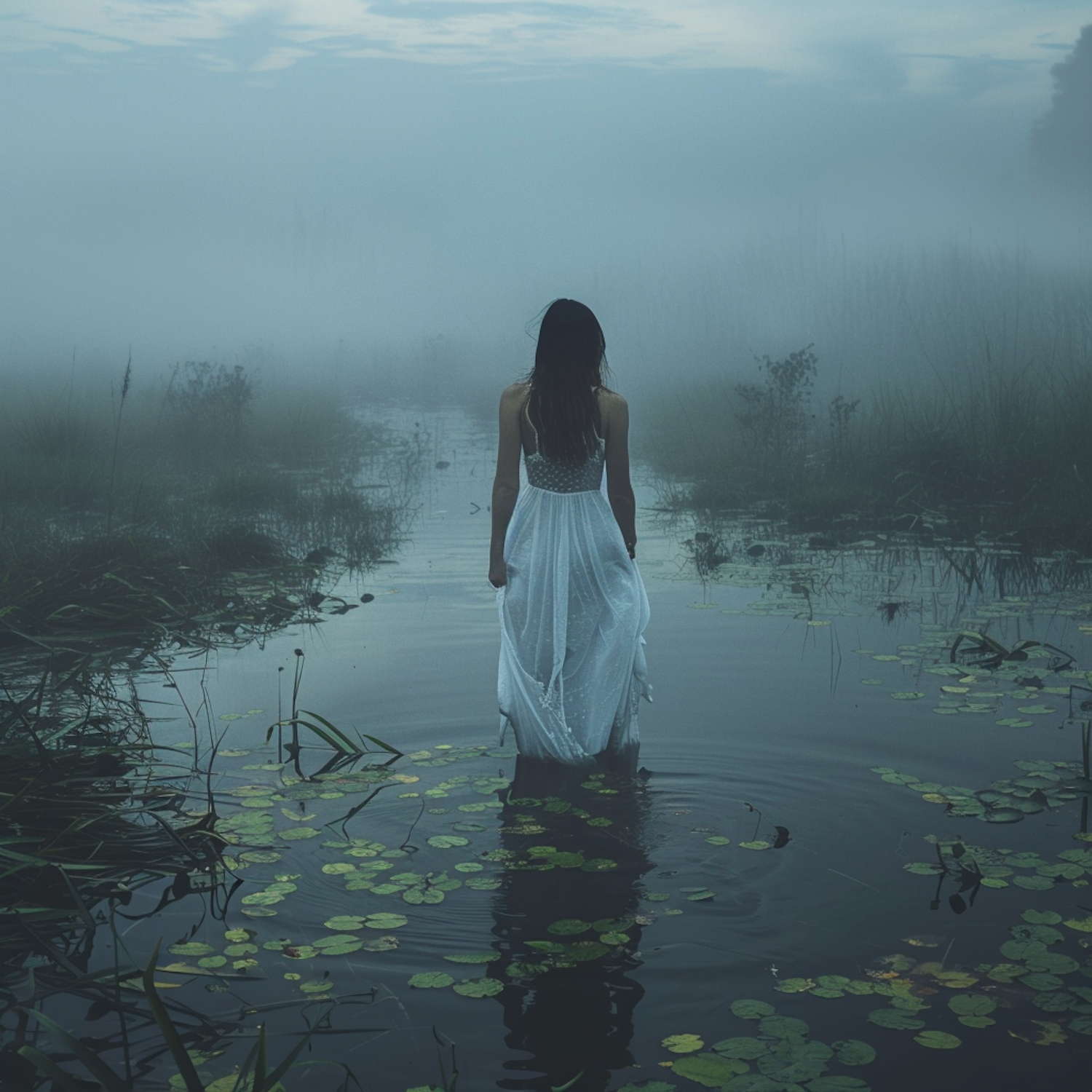 A woman in a white dress stands in a misty marsh, surrounded by lily pads and fog, creating a mysterious and ethereal atmosphere.