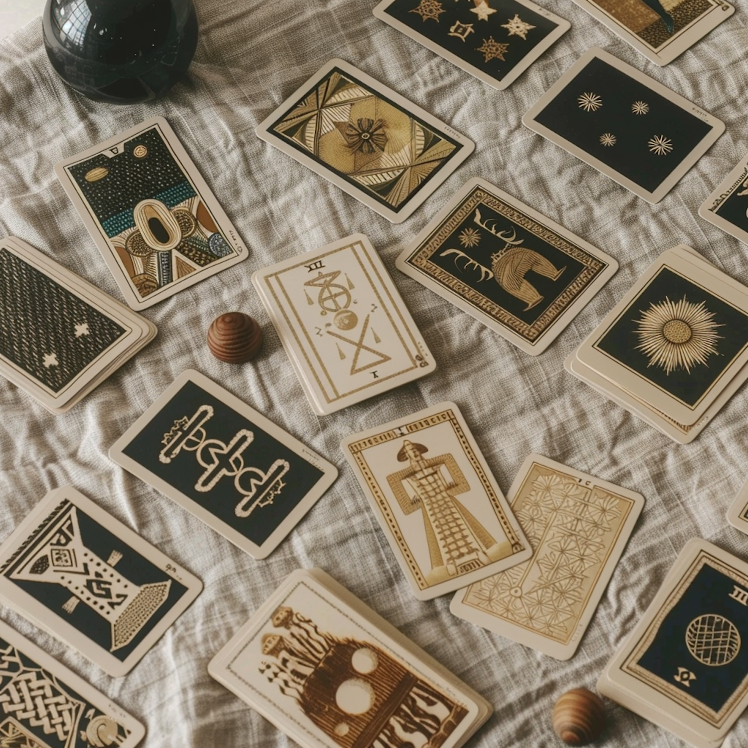 Intricately designed tarot cards spread on fabric with mystical symbols, a crystal ball, and wooden spheres, creating an esoteric atmosphere.