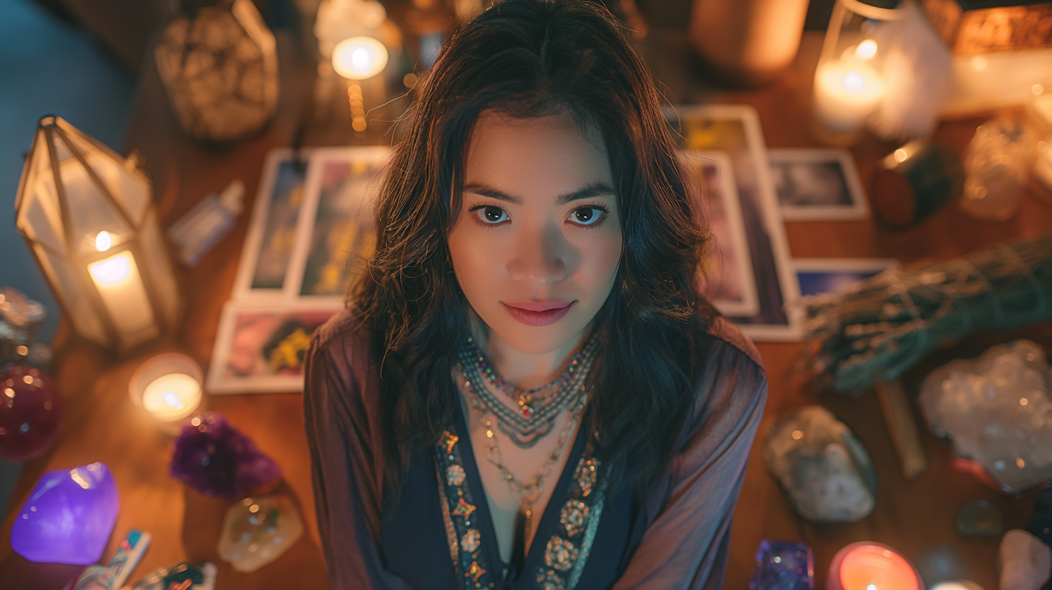 Mystical scene with a young woman surrounded by candles, crystals, and tarot cards, creating a serene and spiritual atmosphere.
