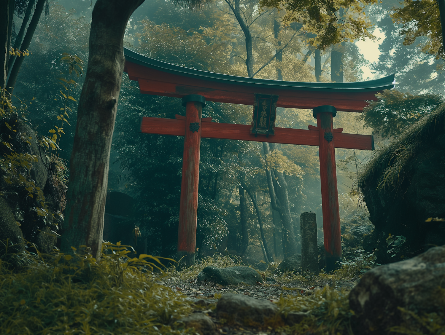 Mystical Torii Gate in Misty Forest