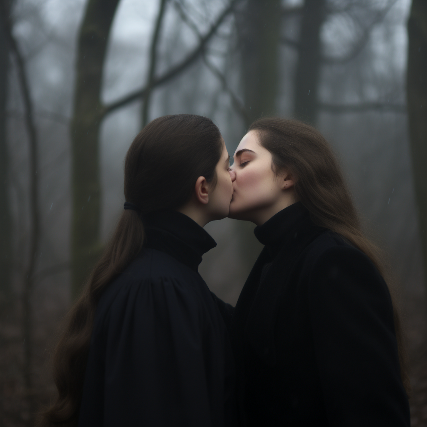 Two women share a tender kiss in a misty forest, surrounded by bare trees and soft fog, creating an intimate and serene atmosphere.