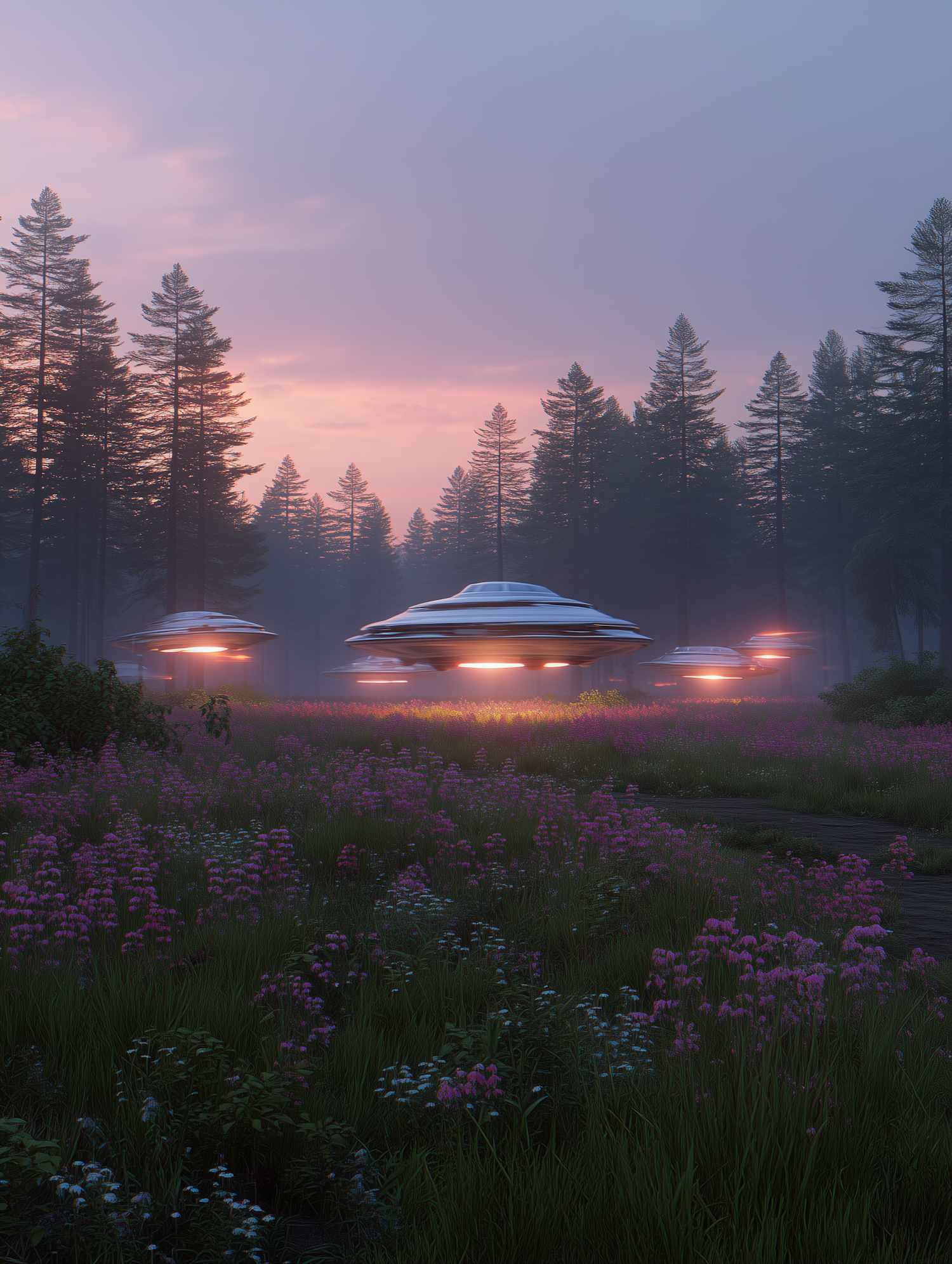 A tranquil forest clearing at dusk with glowing UFOs hovering above vibrant wildflowers, creating a mysterious and serene atmosphere.