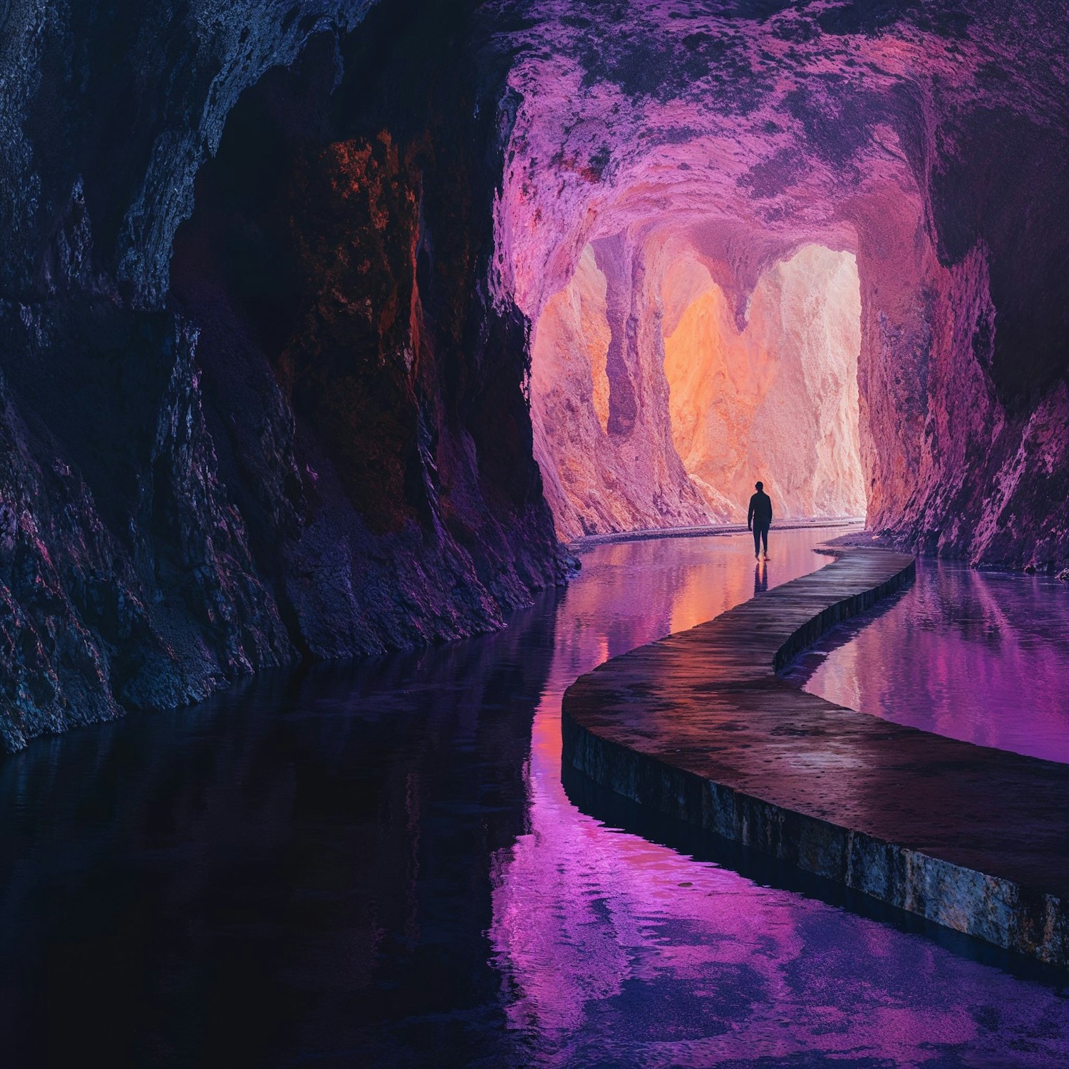 A person walks through a vibrant, colorful cave with purple and pink hues, following a winding path reflected in the water.