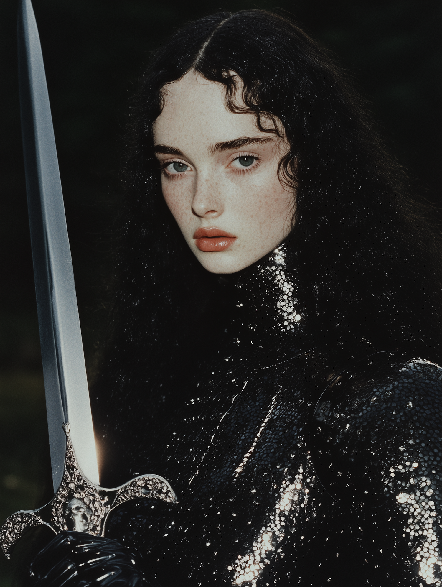 Person with pale skin and curly black hair holding an ornate sword, wearing a shimmering black outfit against a dark background.