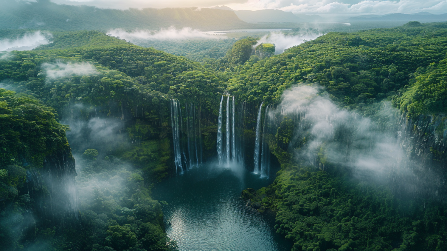 Aerial view of lush rainforest with cascading waterfalls and misty atmosphere, creating a serene and mystical landscape.