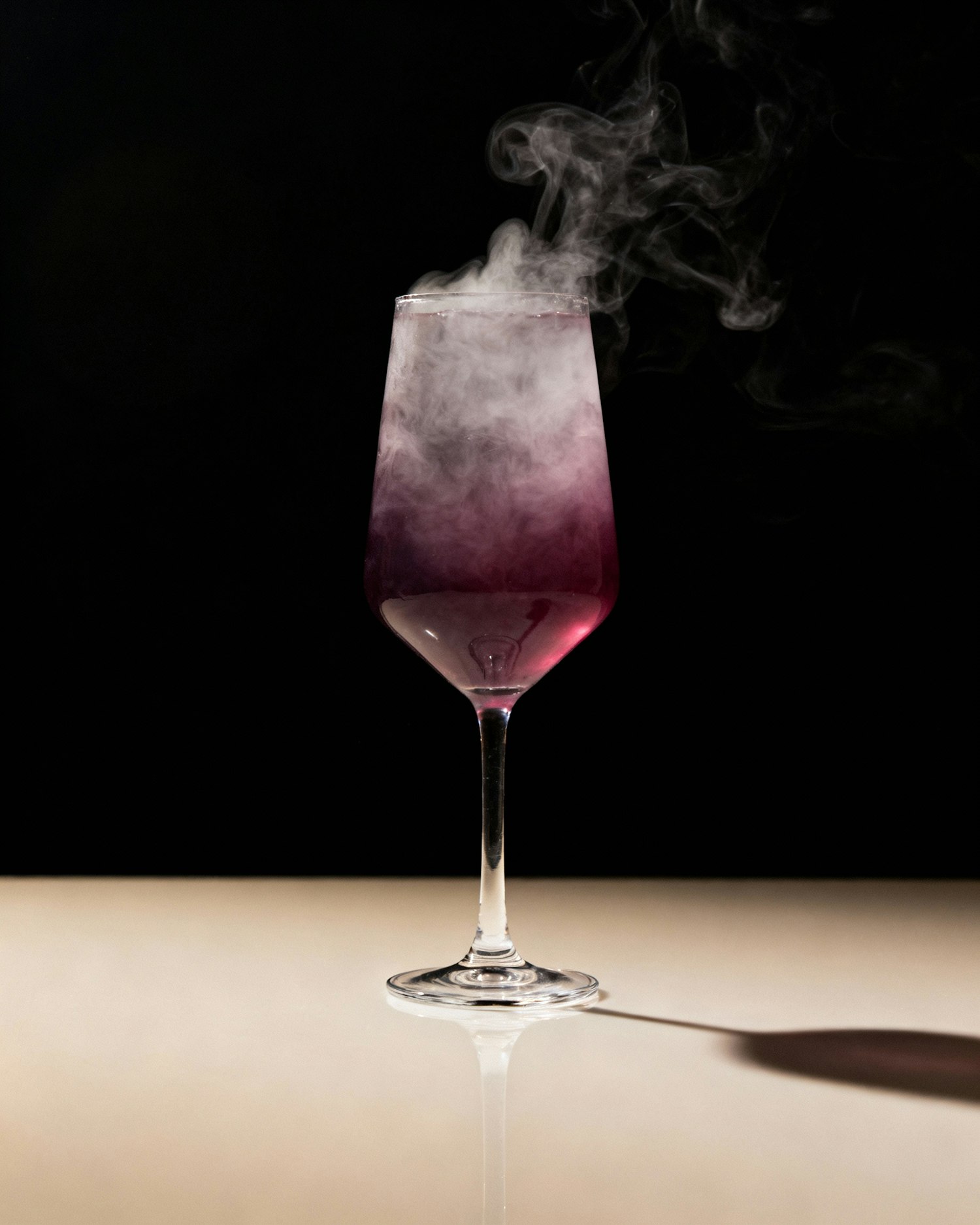 A wine glass with purple liquid and rising vapor on a reflective surface, set against a black background for a dramatic effect.