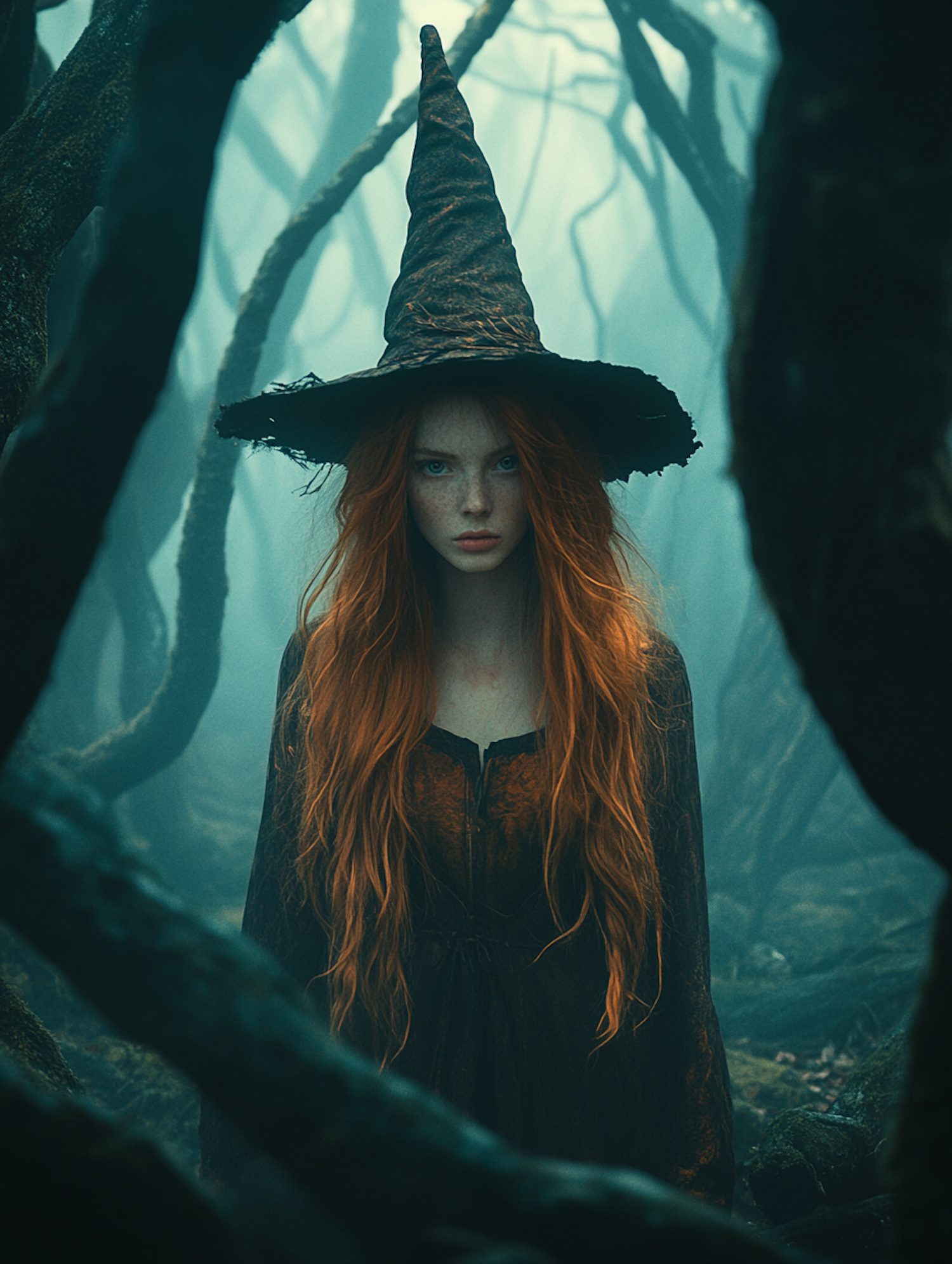 A mysterious red-haired witch in a dark forest, wearing a pointed hat and flowing dress, surrounded by twisted branches and mist.