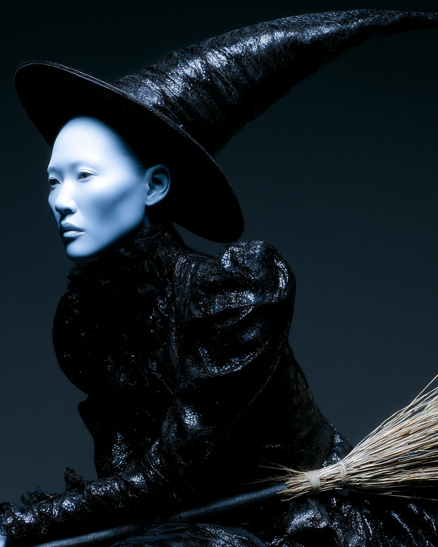 A dramatic portrait of a witch in a shimmering black outfit and pointed hat, holding a broomstick against a dark background.