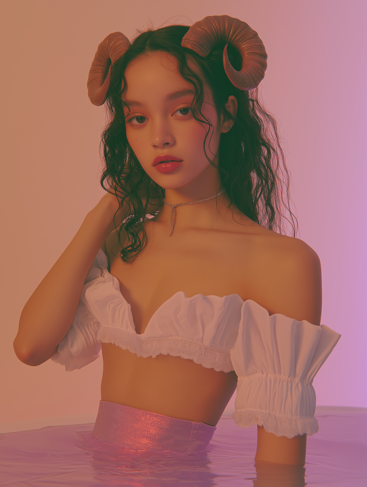 A young woman with ram horns in a white top stands in pink water, set against a dreamy pink and purple background.