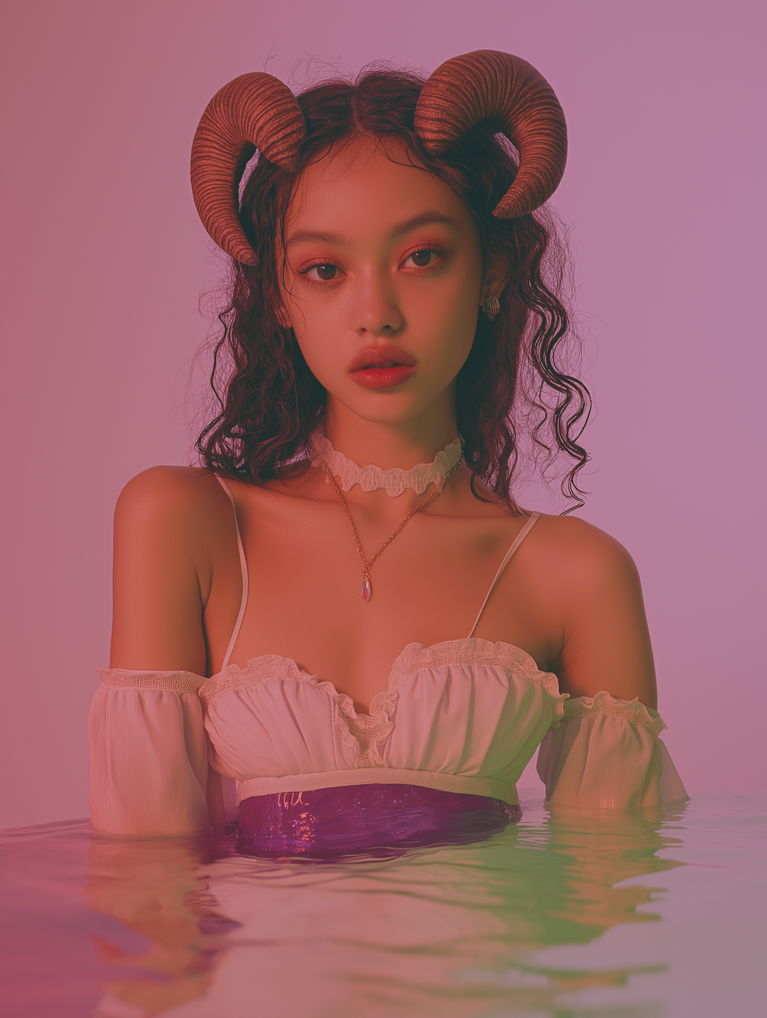 A woman with ram horns in a white dress, submerged in water, under pink and green lighting, creating an ethereal and mystical vibe.