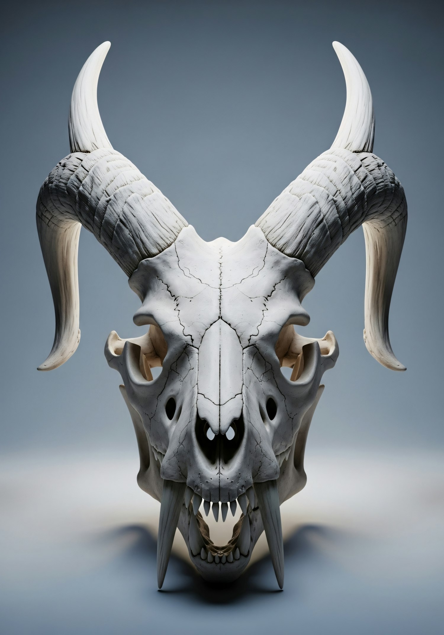 A detailed and symmetrical depiction of a fantastical skull with large, curved horns and sharp, prominent teeth.