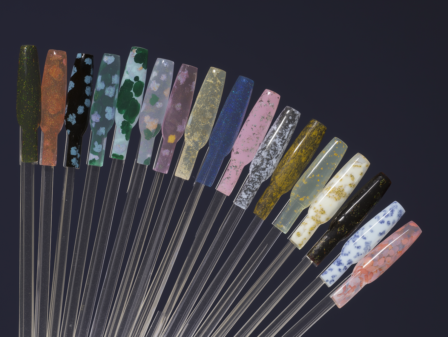 A vibrant nail sampler showcasing unique colors, patterns, and styles arranged in a fan formation on clear sticks.