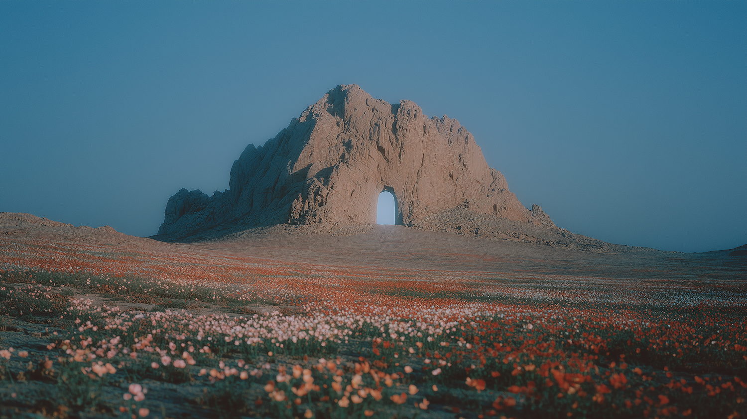 A stunning natural arch rises above a colorful field of wildflowers under a clear blue sky, creating a serene and vibrant landscape.