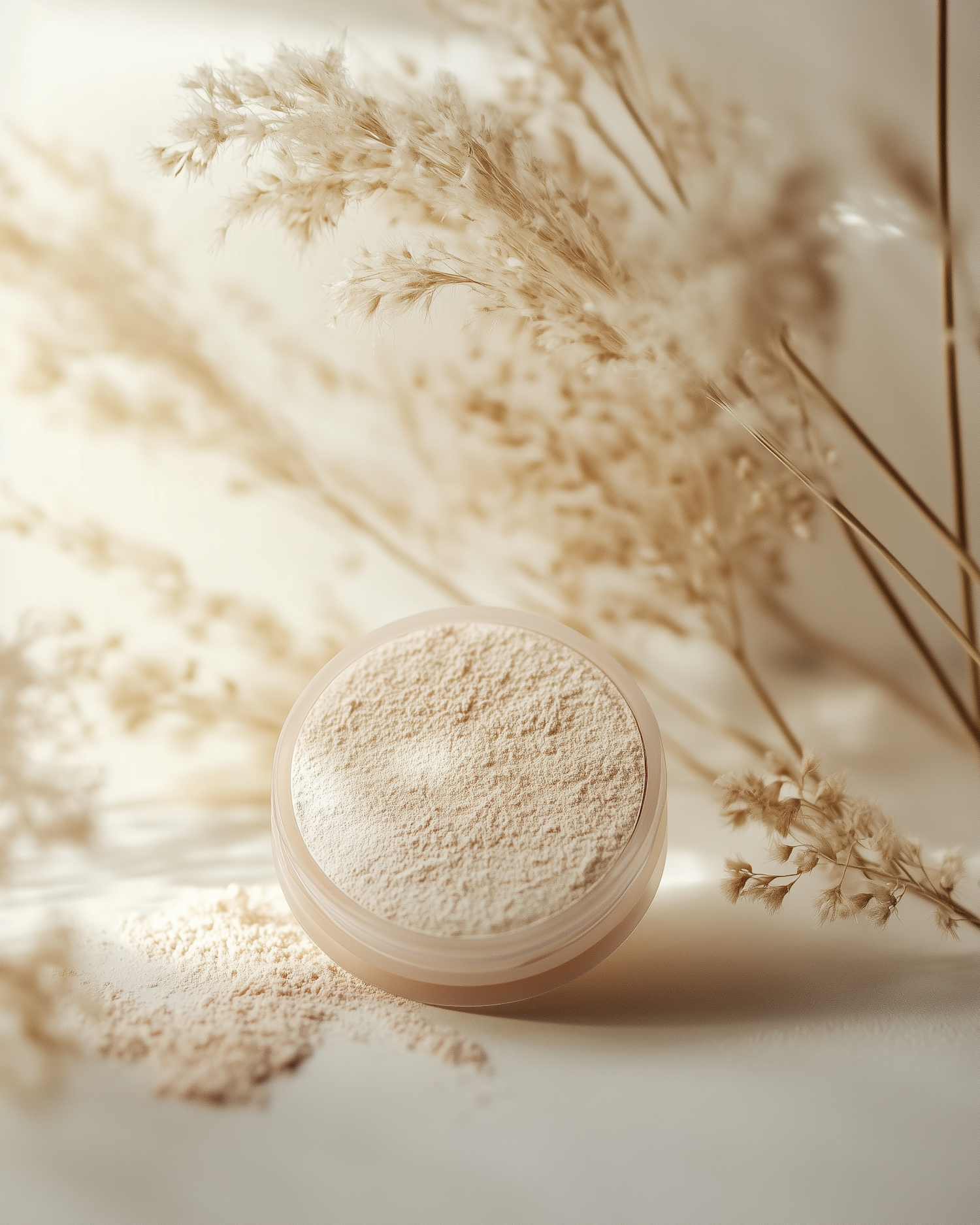 Elegant loose powder with pampas grass, warm lighting, and minimalistic design for a serene, natural beauty aesthetic.