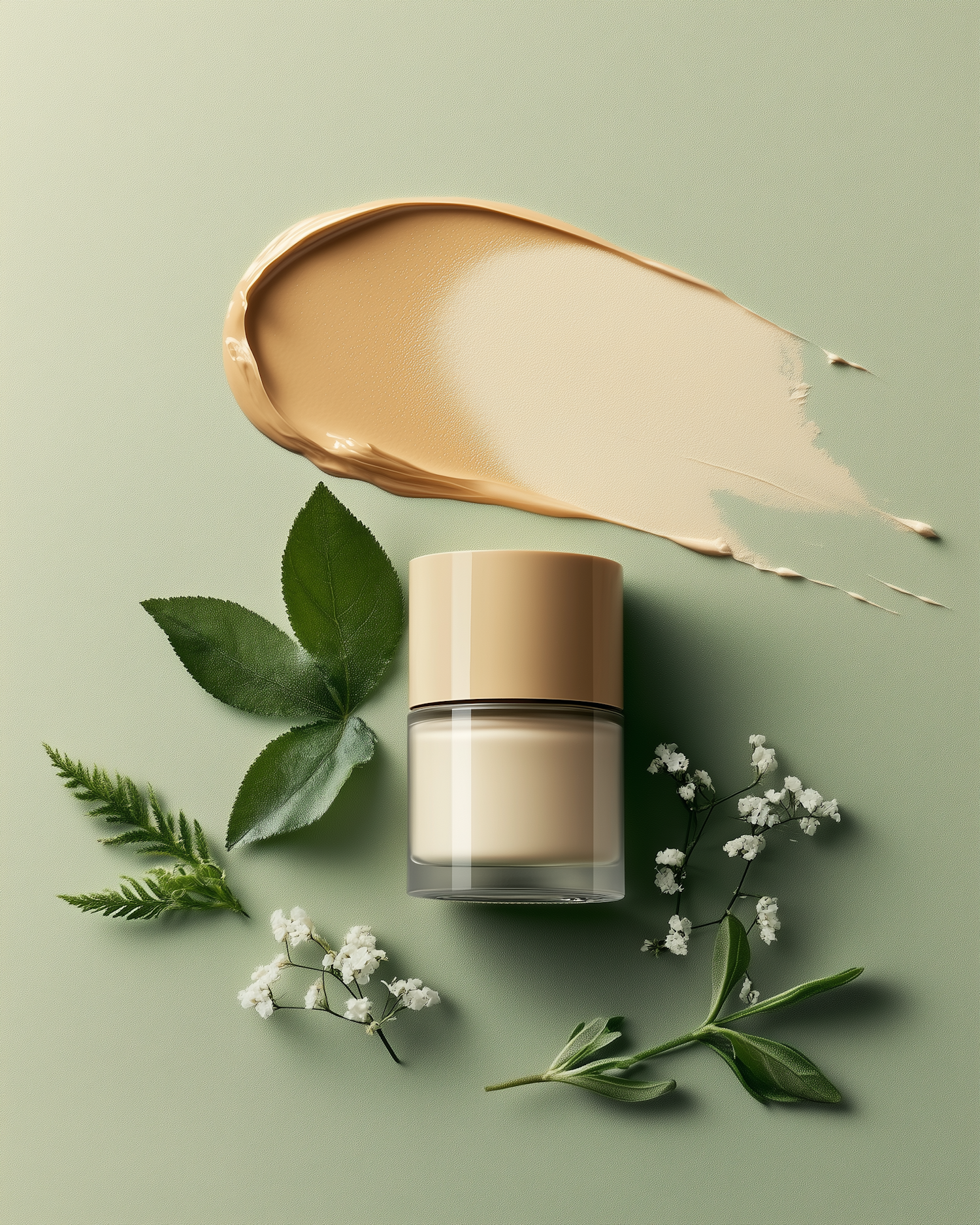 Cosmetic jar with beige lid on green background, surrounded by leaves and flowers, with a foundation smear above.