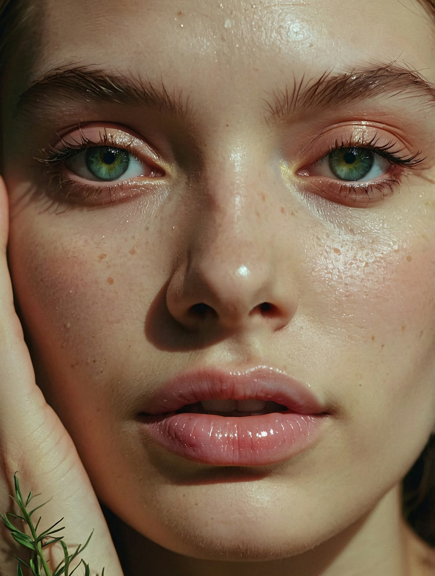 Close-up of a young woman with dewy skin, green eyes, glossy lips, and freckles, complemented by minimal makeup and natural lighting.