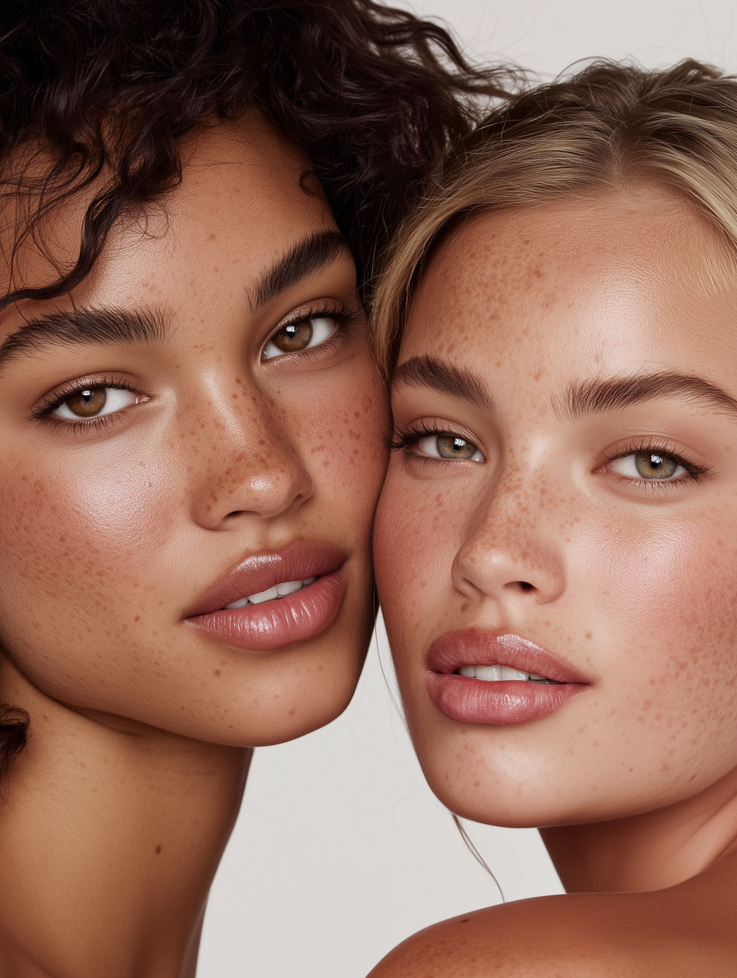 Close-up of two individuals with radiant skin and freckles, showcasing natural beauty and minimal makeup in a neutral setting.