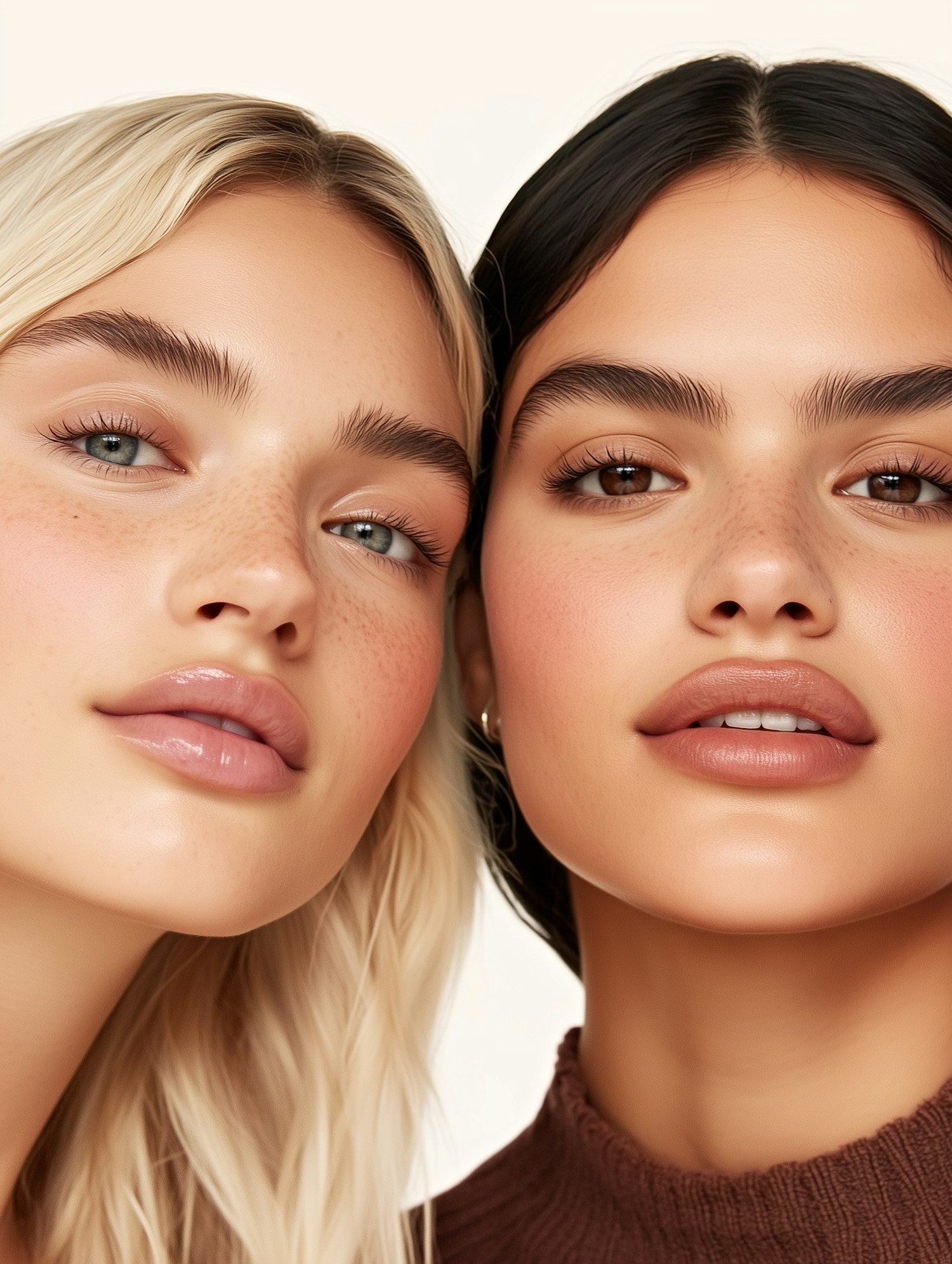 Close-up of two women with natural makeup, freckles, and thick eyebrows. One has blonde hair and blue-green eyes, the other dark hair and brown eyes.