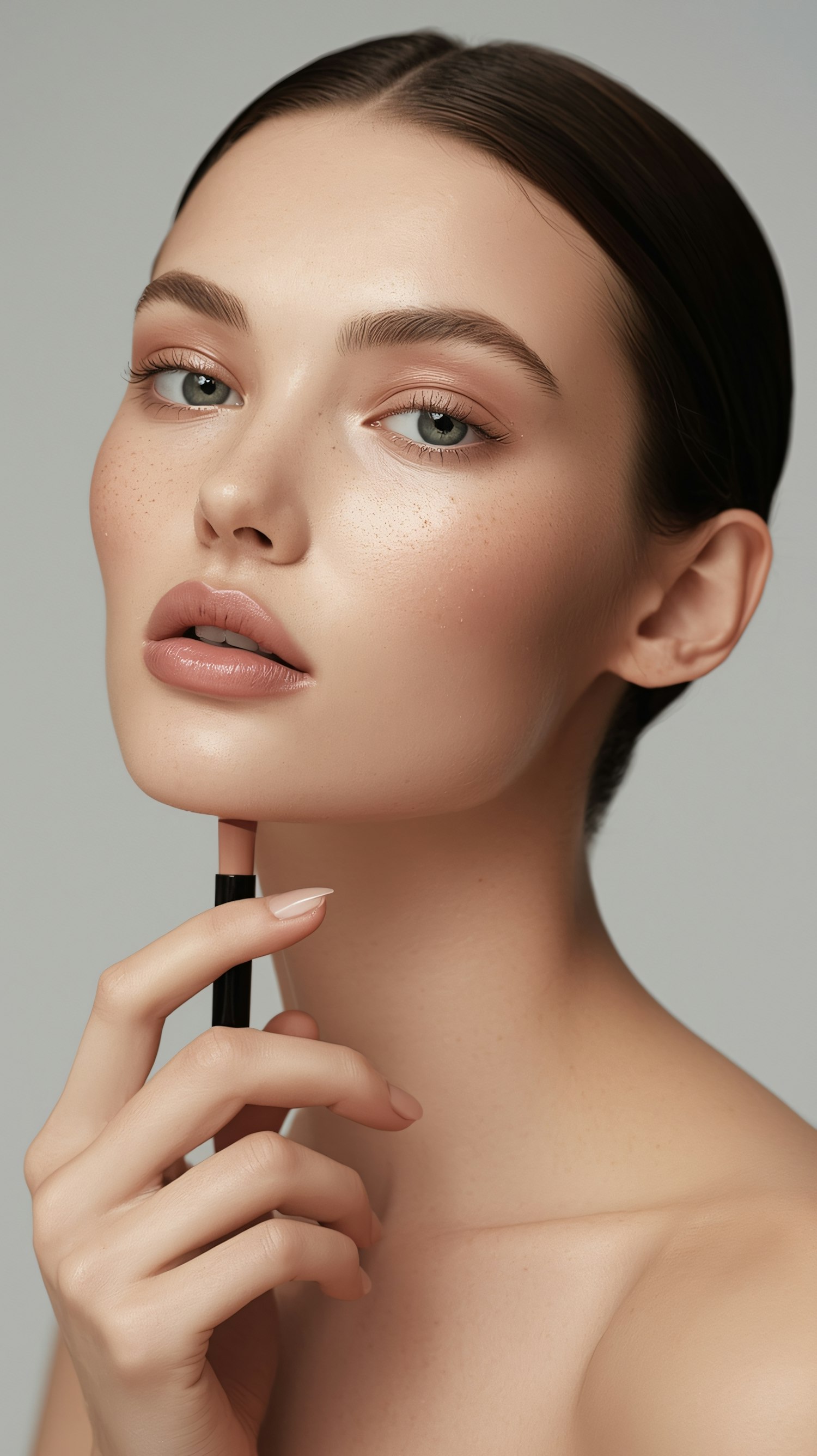 Close-up of a young woman with natural makeup, light freckles, and sleek hair, holding a makeup brush against a neutral background.