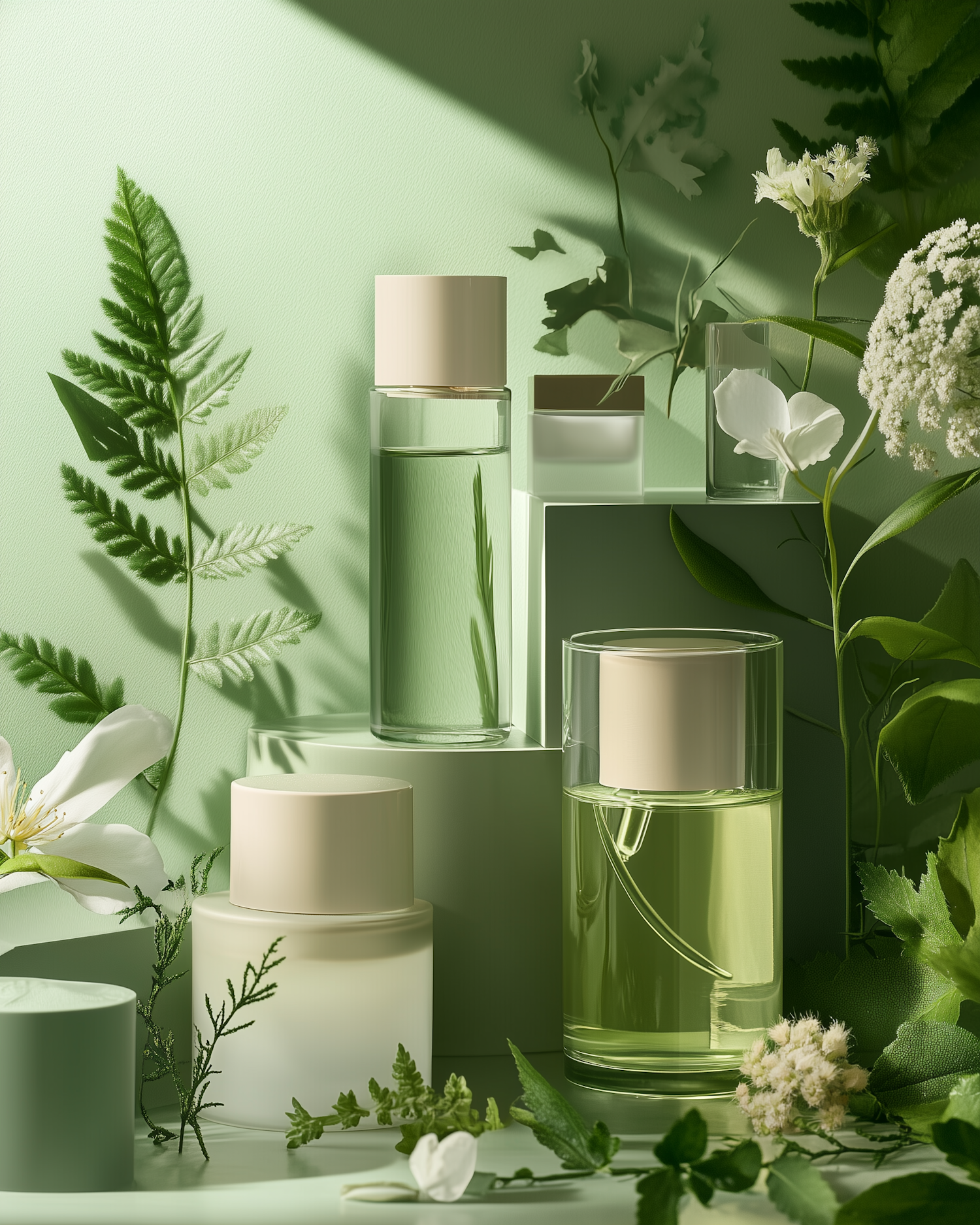 Elegant cosmetic bottles surrounded by lush green foliage and white flowers, set against a soft green background.