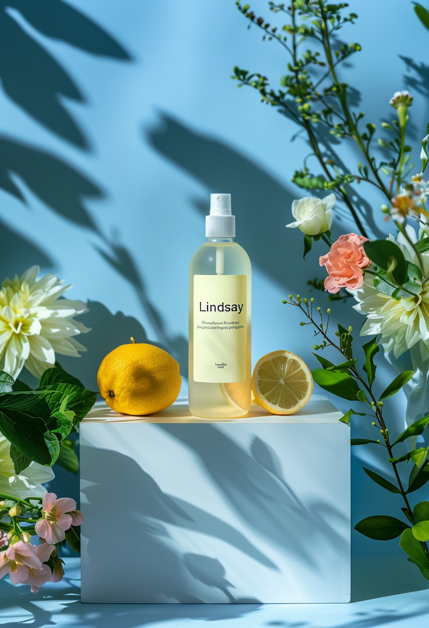 Citrus-themed spray bottle with lemons and flowers on a white pedestal against a blue background.