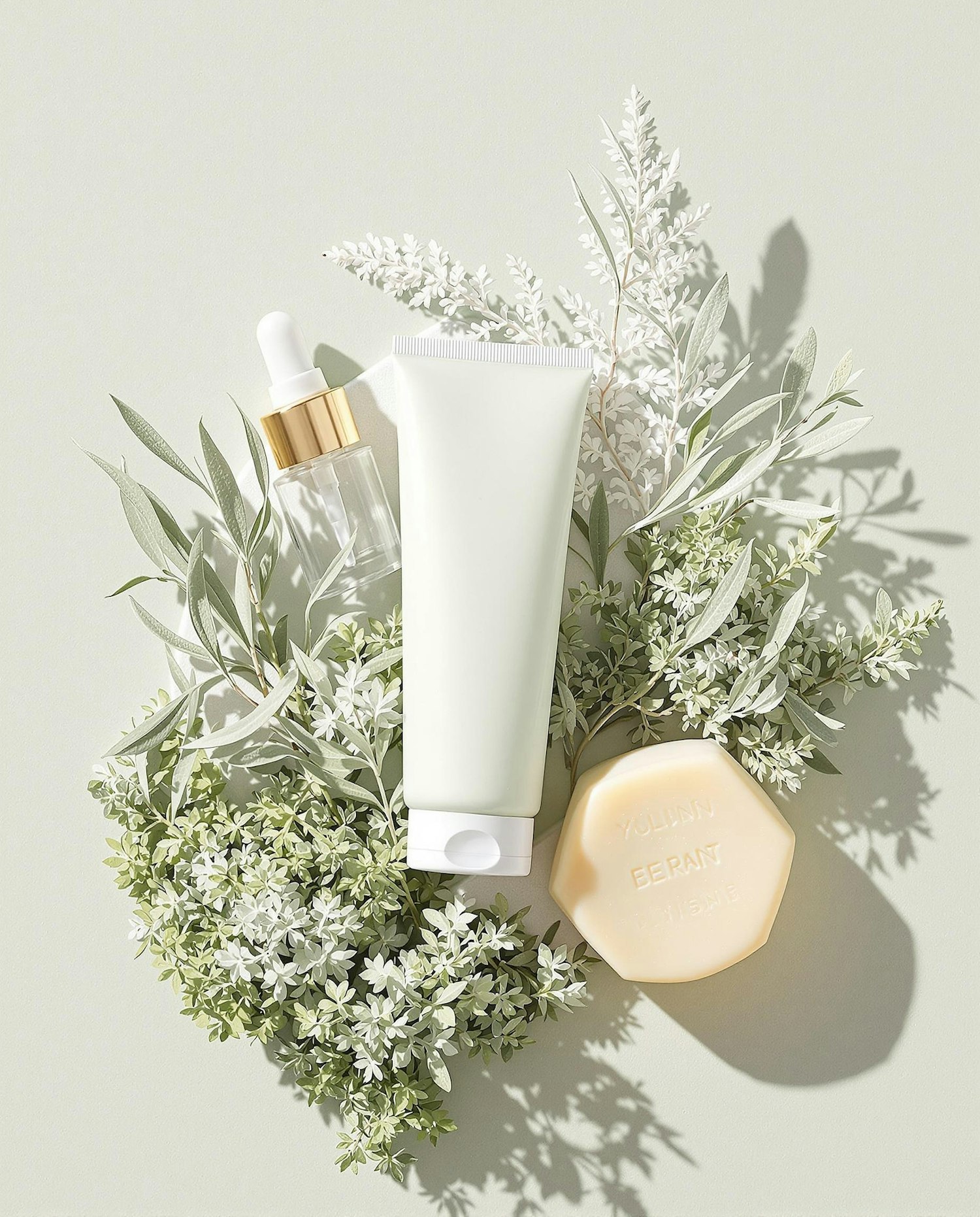 A minimalistic cosmetic product layout with natural greenery and soft lighting, showcasing a tube, soap, and dropper bottle.