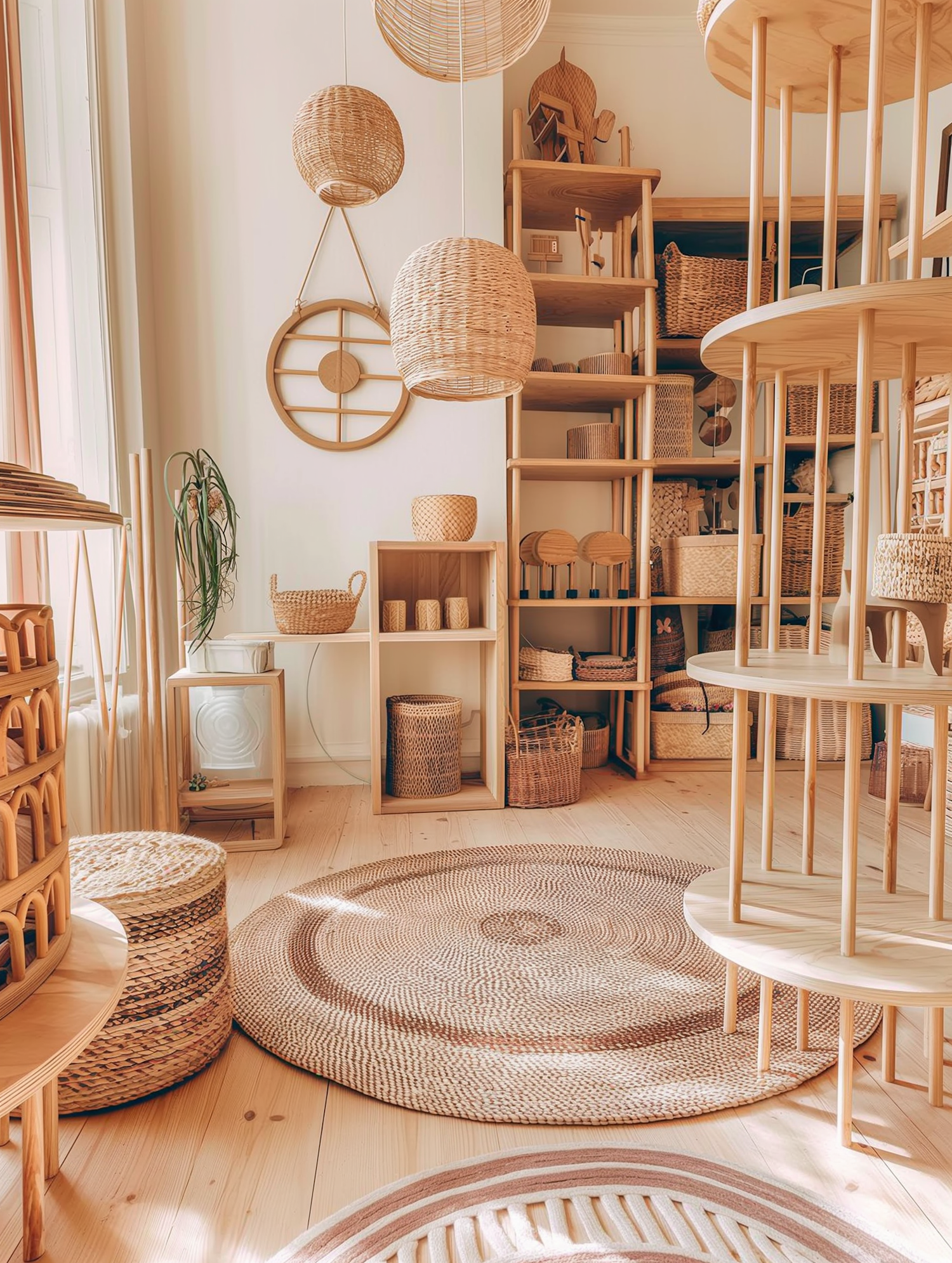 Sunlit room with natural wood and woven decor, featuring circular rugs, pendant lights, and shelves with baskets for a cozy, minimalist vibe.