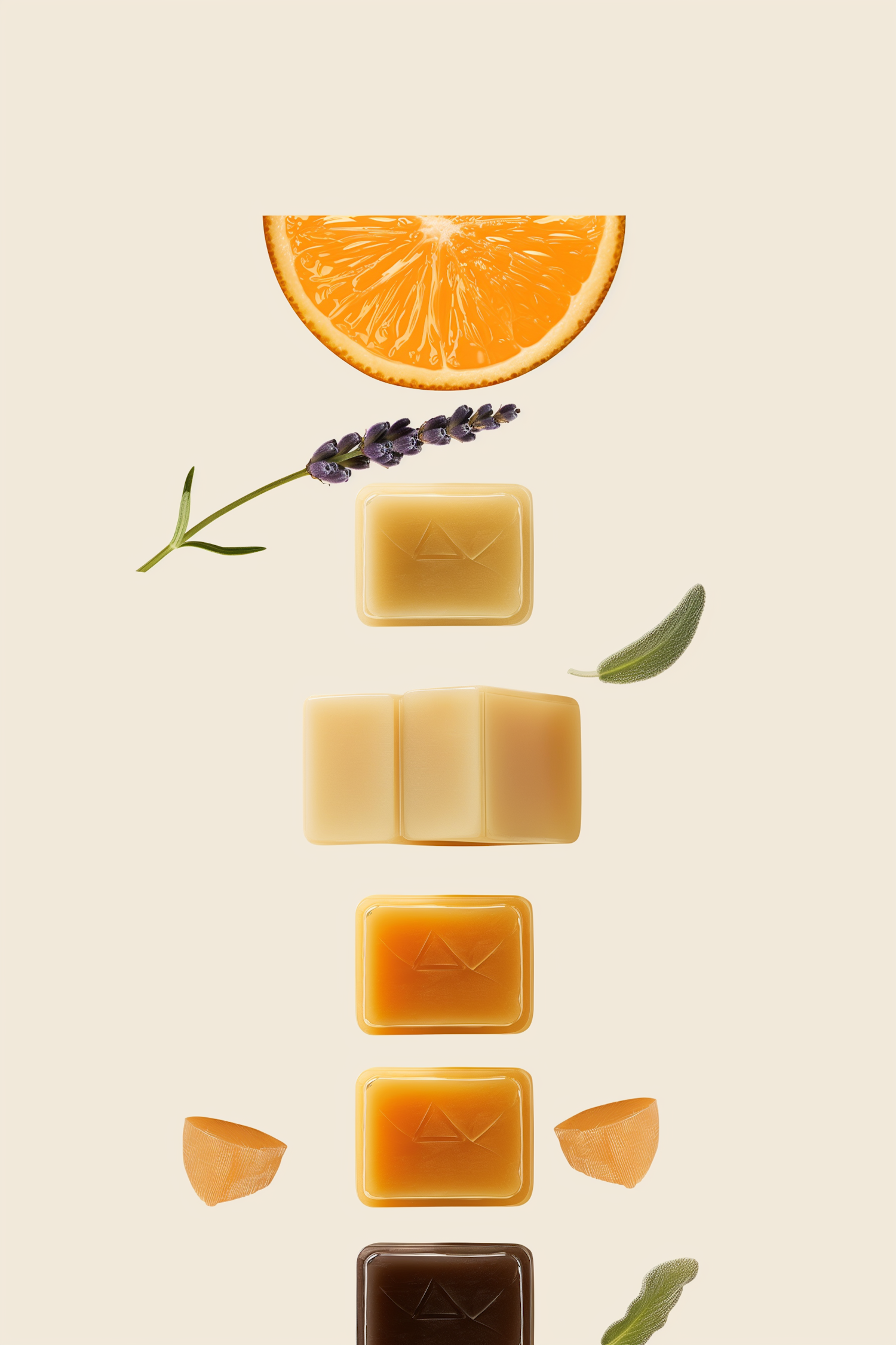 Minimalist arrangement of orange slice, lavender, wax blocks, sage leaves, and orange peel on a beige background.