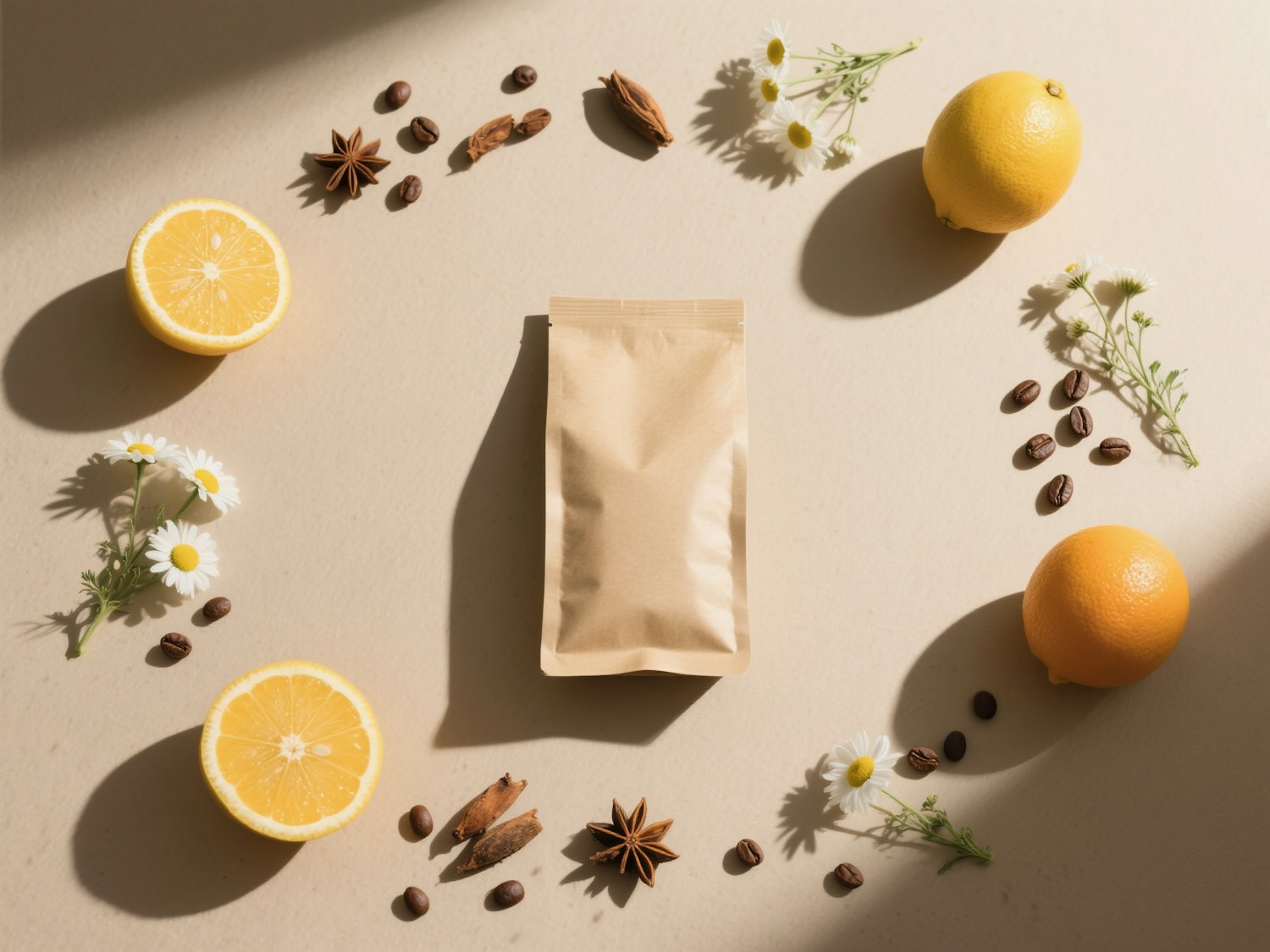 Minimalist flat lay with a beige pouch, lemons, chamomile, coffee beans, and spices on a neutral background with soft shadows.