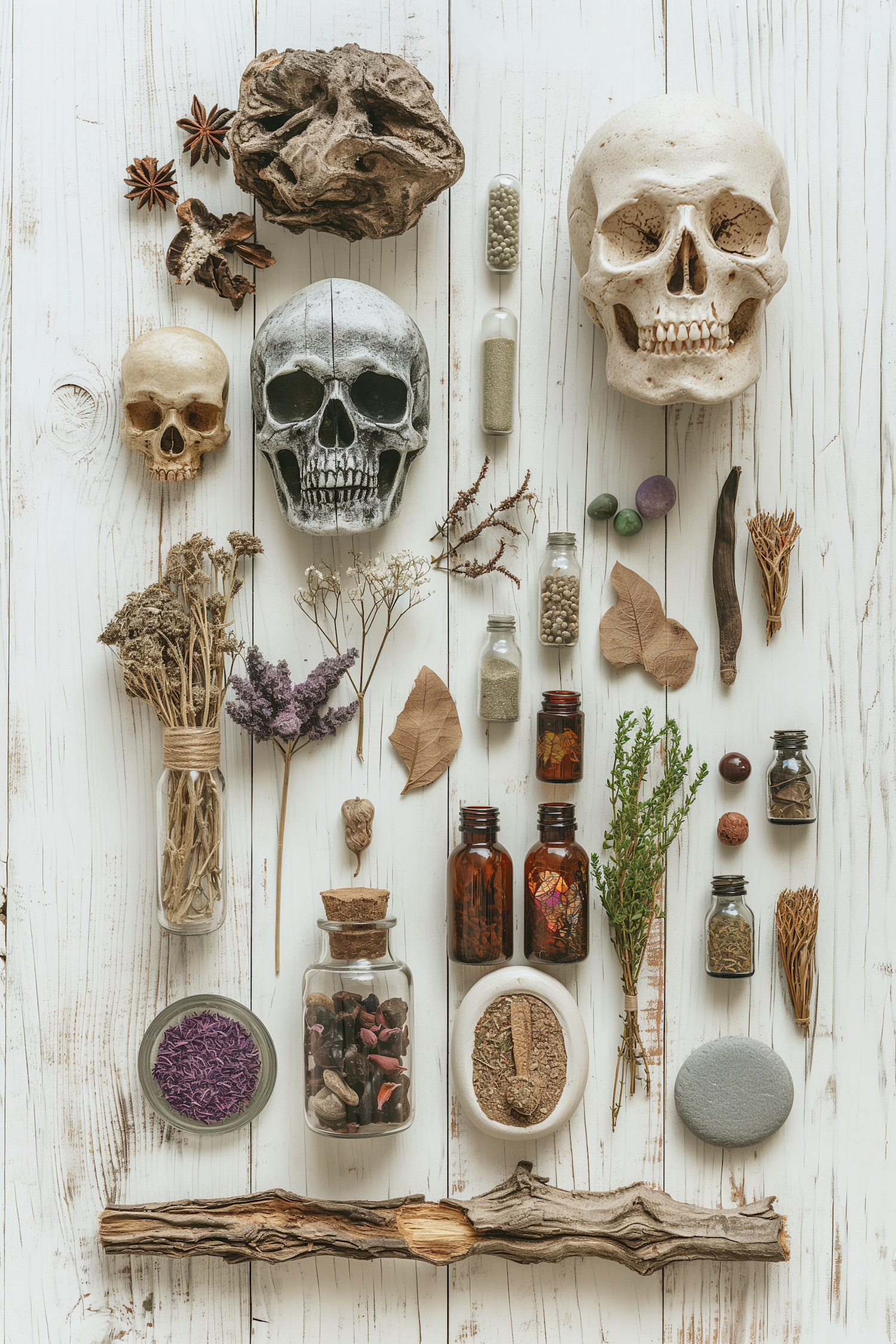 Intriguing arrangement of skulls, dried flowers, and glass bottles on a white wooden surface, evoking a mystical, natural vibe.