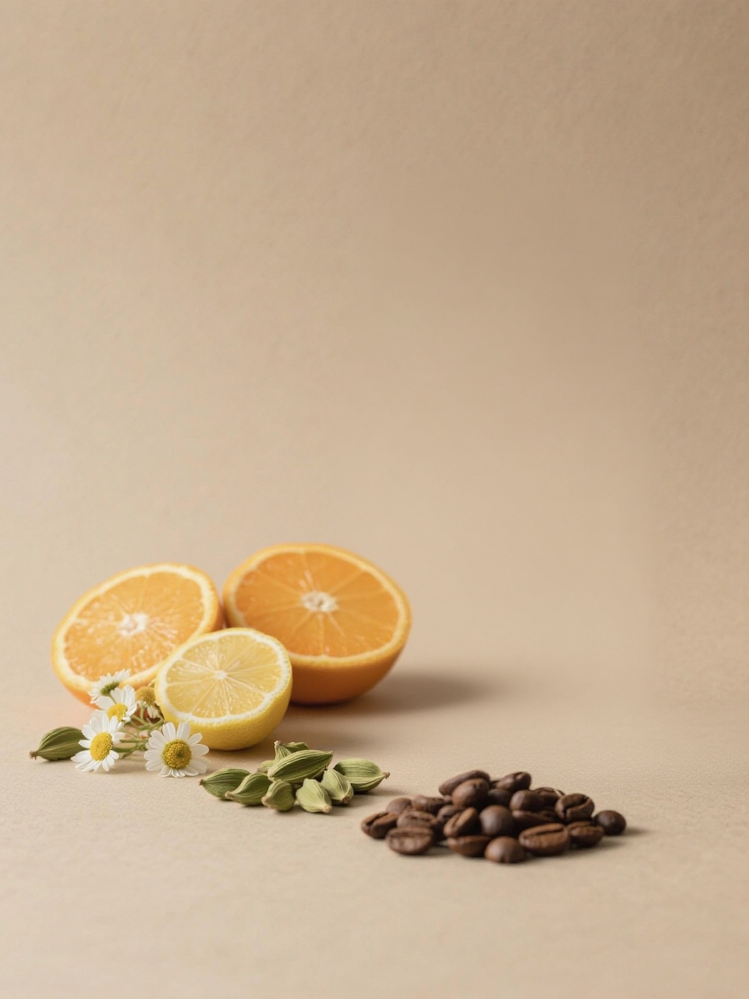 Aesthetic arrangement of coffee beans, cardamom pods, chamomile flowers, and citrus fruits on a beige background.
