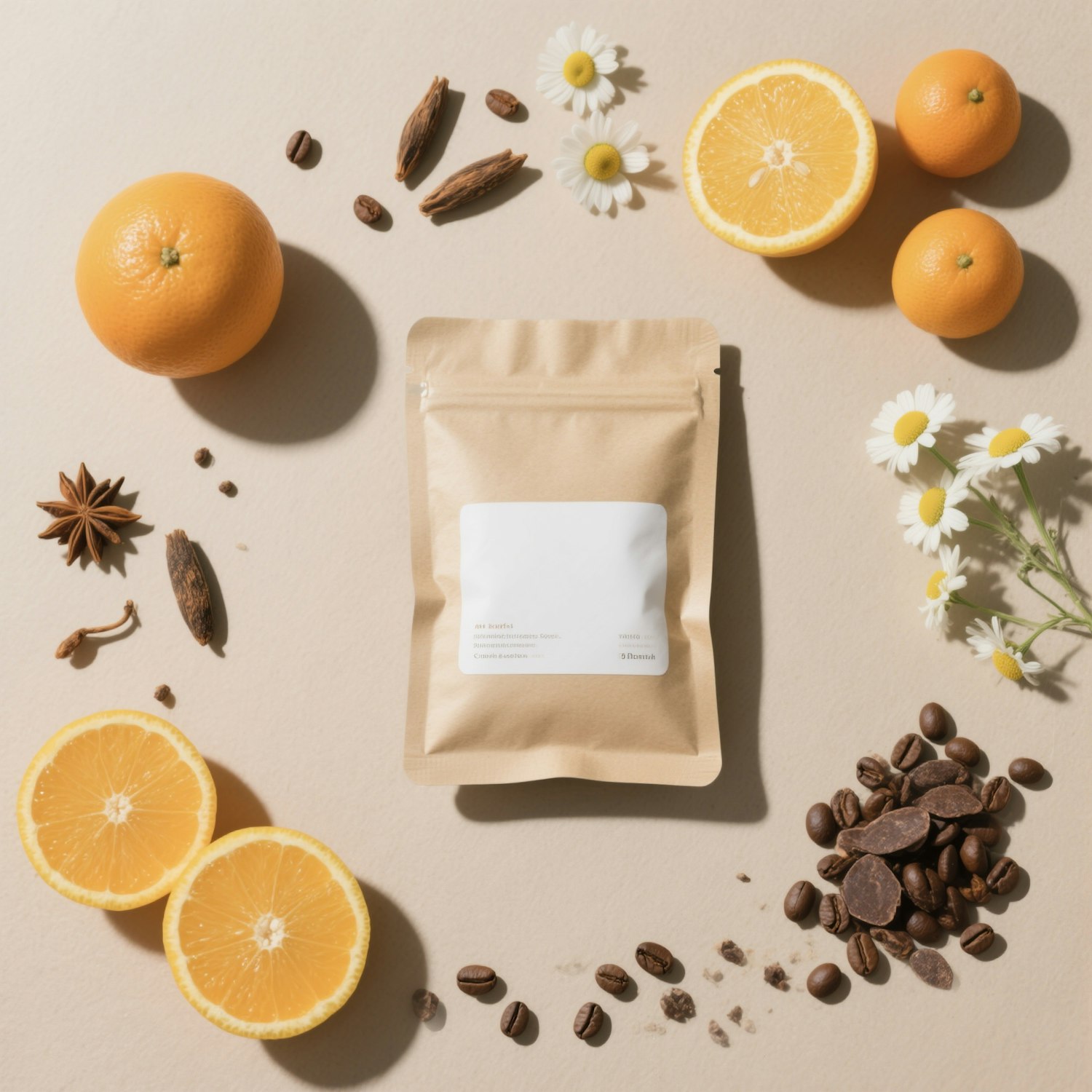 Flat lay of a kraft pouch surrounded by oranges, chamomile, coffee beans, and spices on a beige background. Perfect for natural product branding.