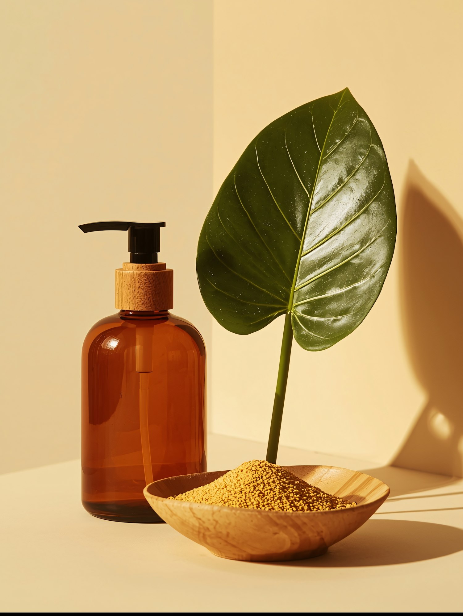 Minimalist setup with a brown glass pump bottle, green leaf, and wooden bowl of granules on a beige background.