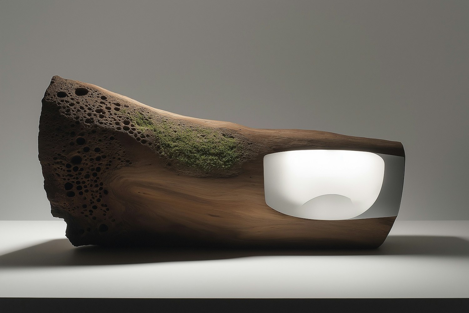 A unique wooden sculpture with mossy textures and a sleek, modern hollow design, blending natural and contemporary aesthetics.