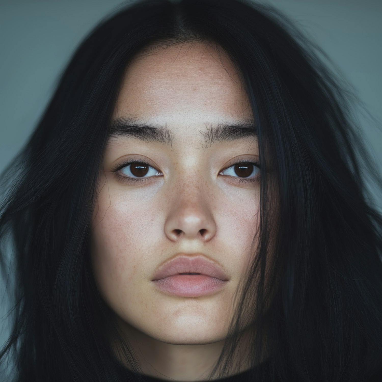 Close-up portrait of a young woman with natural freckles, dark brown eyes, and tousled black hair against a muted gray background.
