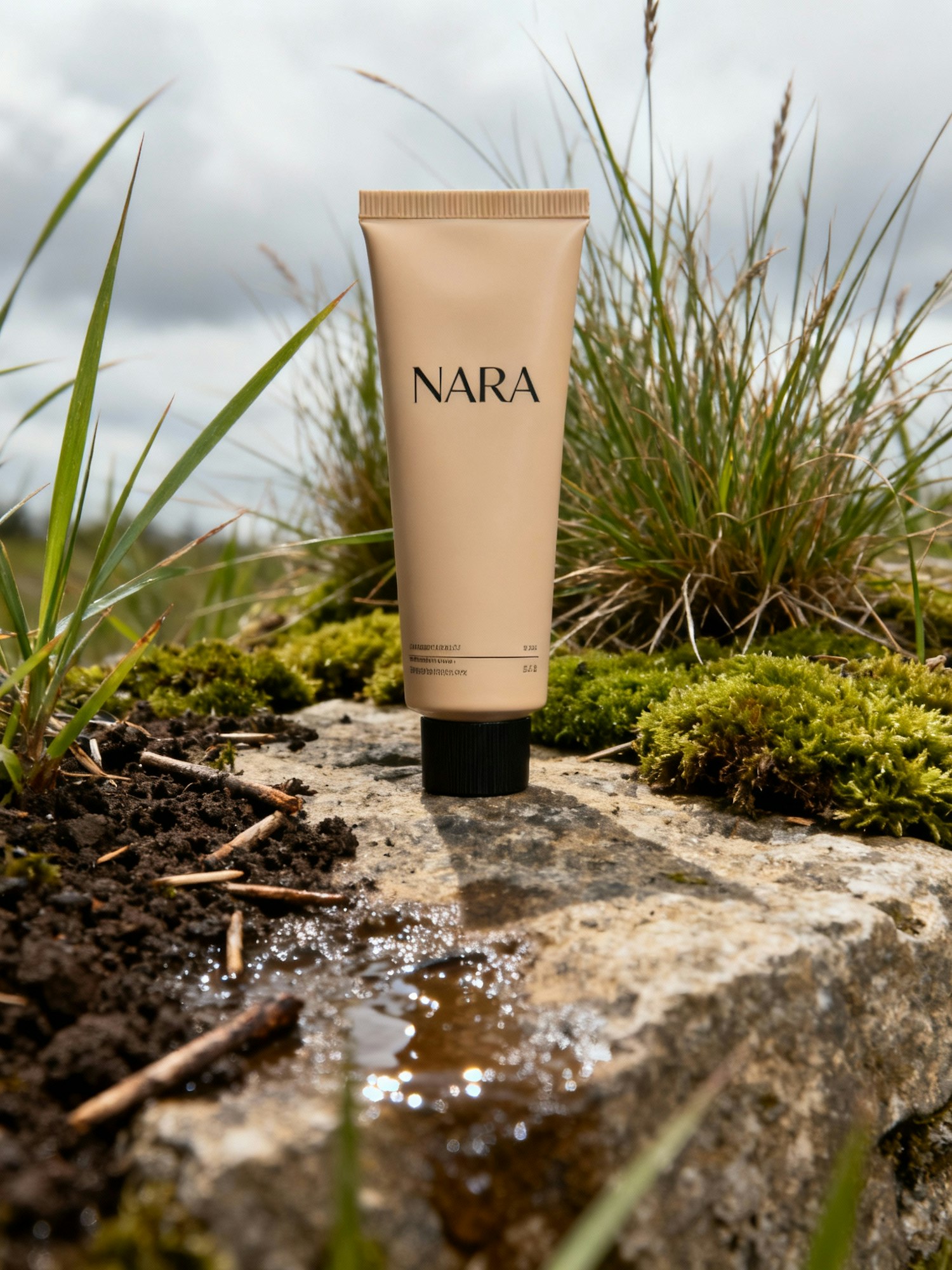 NARA skincare beige matte tube placed on a rough stone surface surrounded by wild grass, moss, and small twigs. Natural outdoor lighting, cloudy sky ambiance, balanced highlights and soft contrast. The scene feels sensory and grounded, with damp soil textures and subtle reflections on the tube. Earthy tones dominate — moss green, sand beige, and muted brown. Realistic depth, macro photography aesthetic, minimalist composition inspired by Aesop-like campaigns.