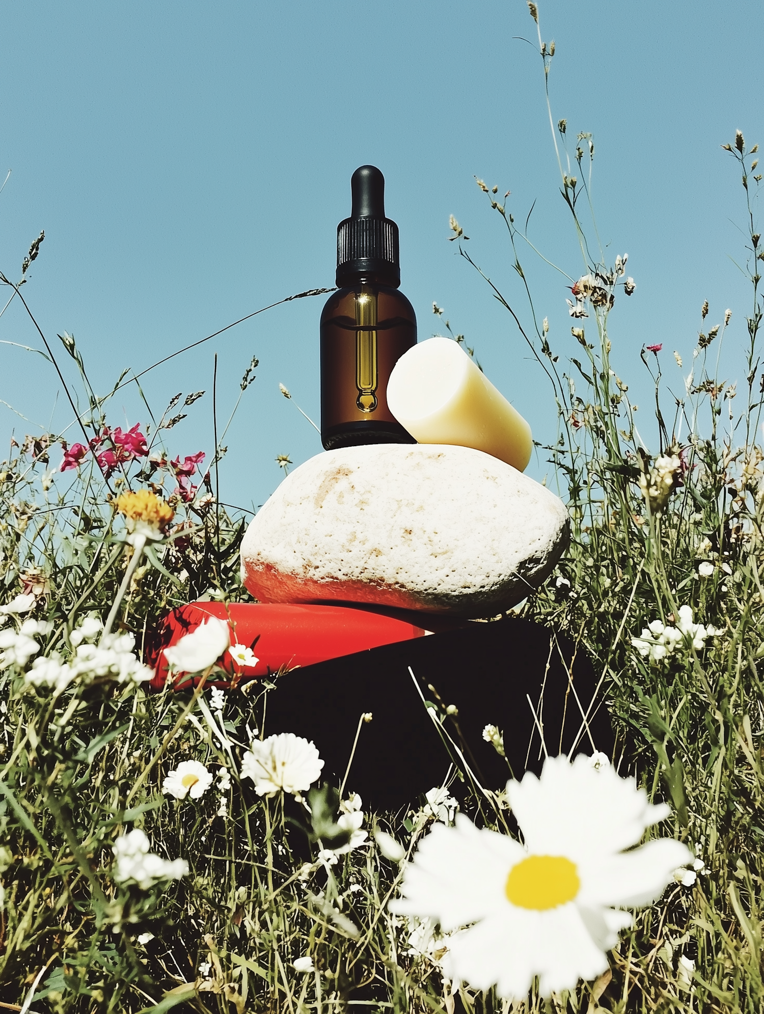 Natural skincare products displayed on a stone in a wildflower field under a clear blue sky. Perfect for eco-friendly and wellness themes.