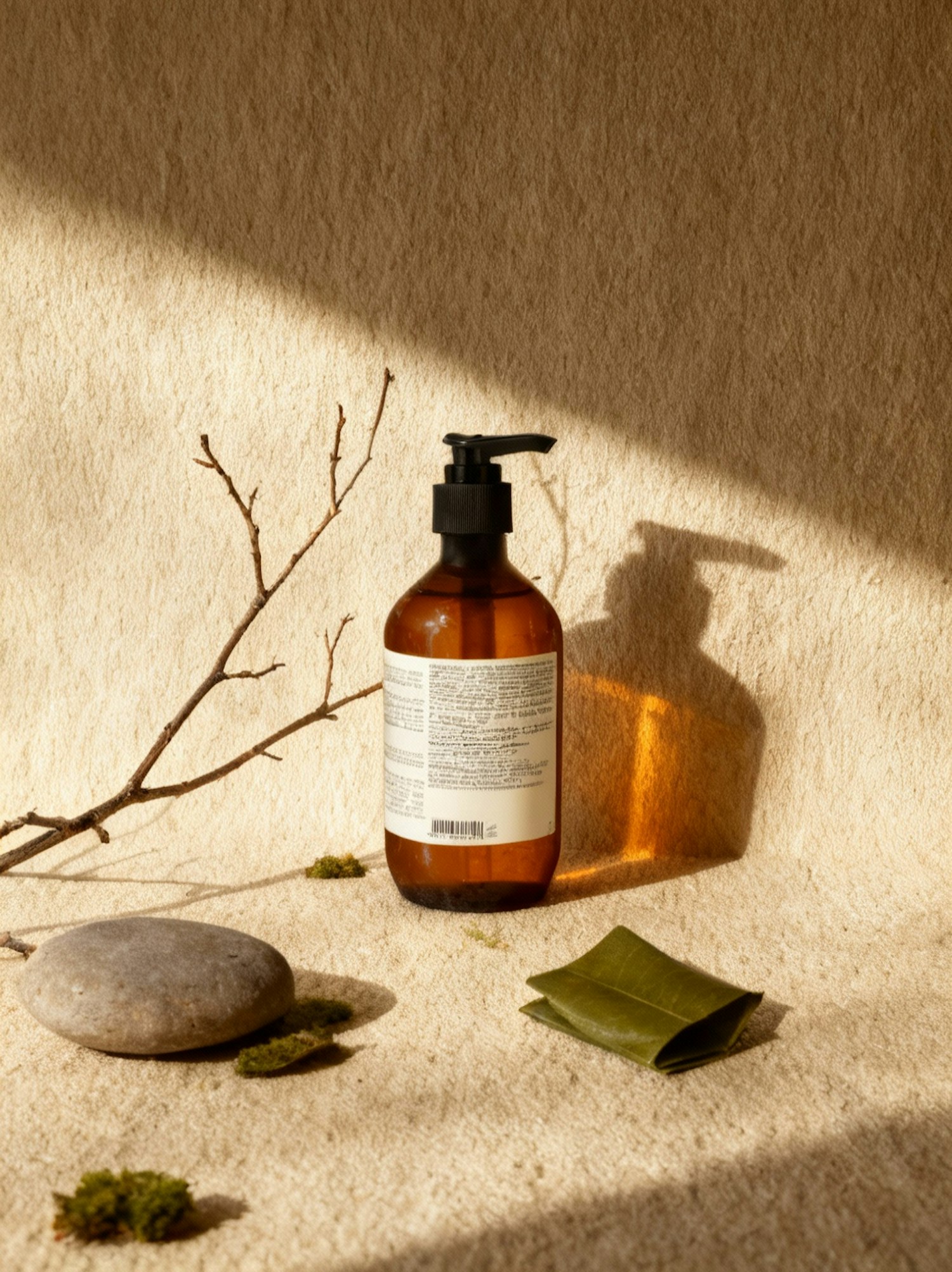 A brown glass bottle with a pump surrounded by natural elements like a stone, moss, and a leaf on a beige textured surface.