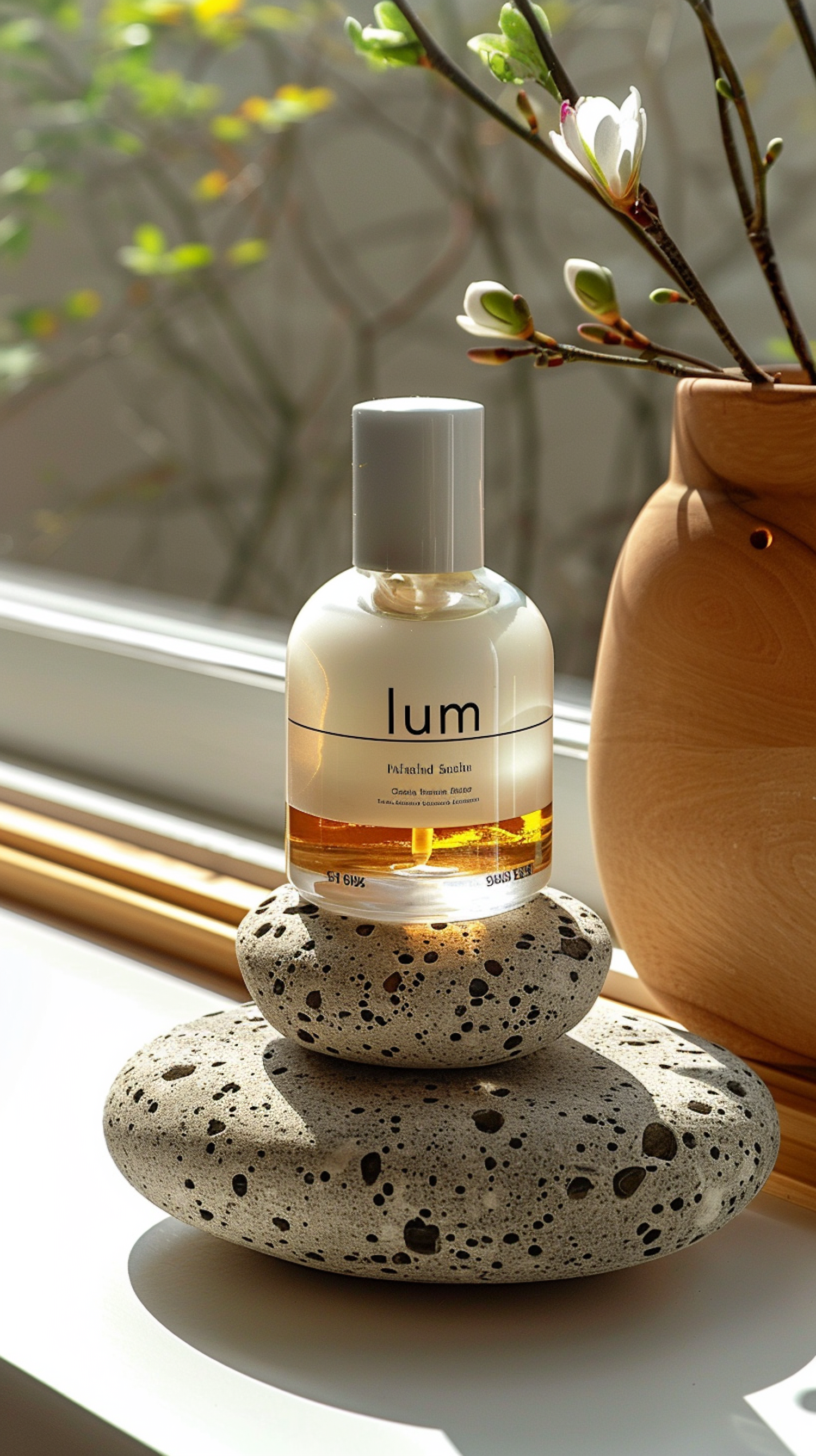 Elegant 'lum' facial oil bottle on porous stones with sunlight, wooden vase, and budding branches in a serene setting.