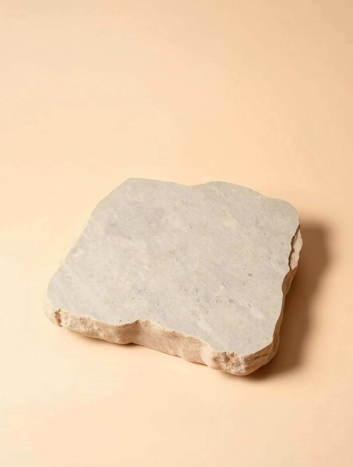 Flat beige stone slab with rough edges on a light peach background, perfect for rustic decor or natural-themed designs.