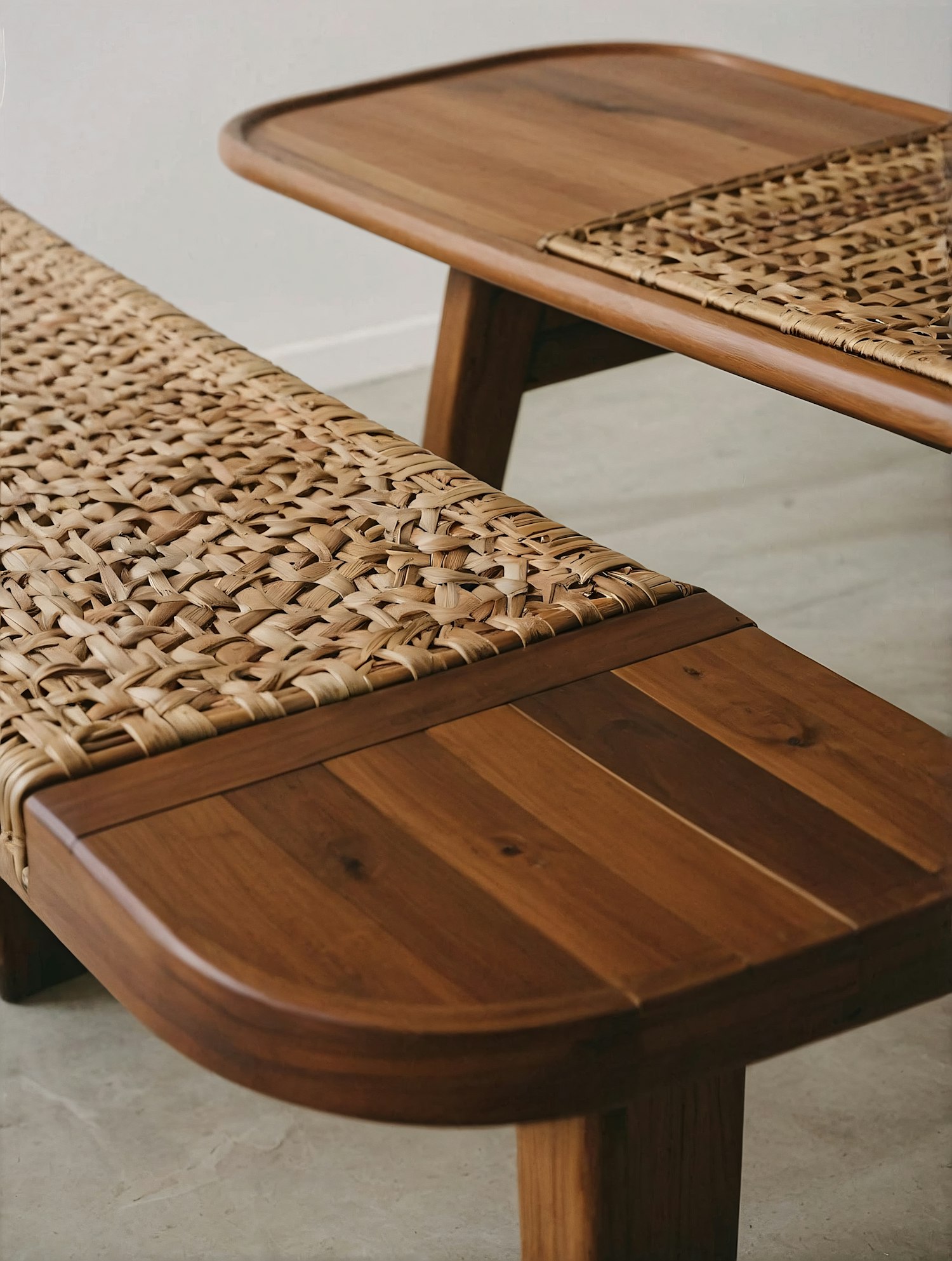 Beautiful wooden furniture with woven rattan details, featuring a bench and table with warm tones and intricate craftsmanship.