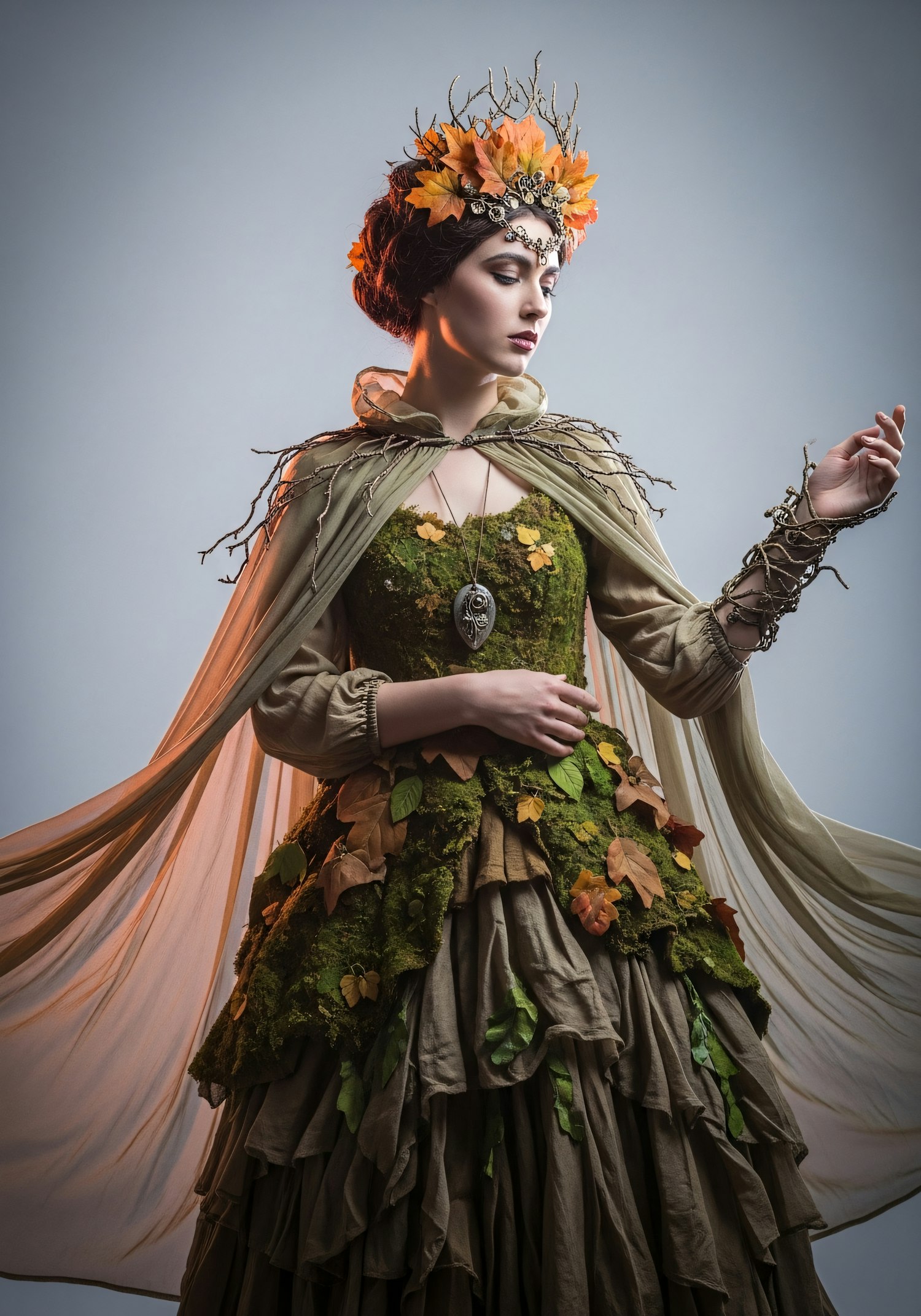 A woman in a nature-inspired costume with moss, leaves, and a twig crown, evoking a fantasy forest theme in a neutral background.