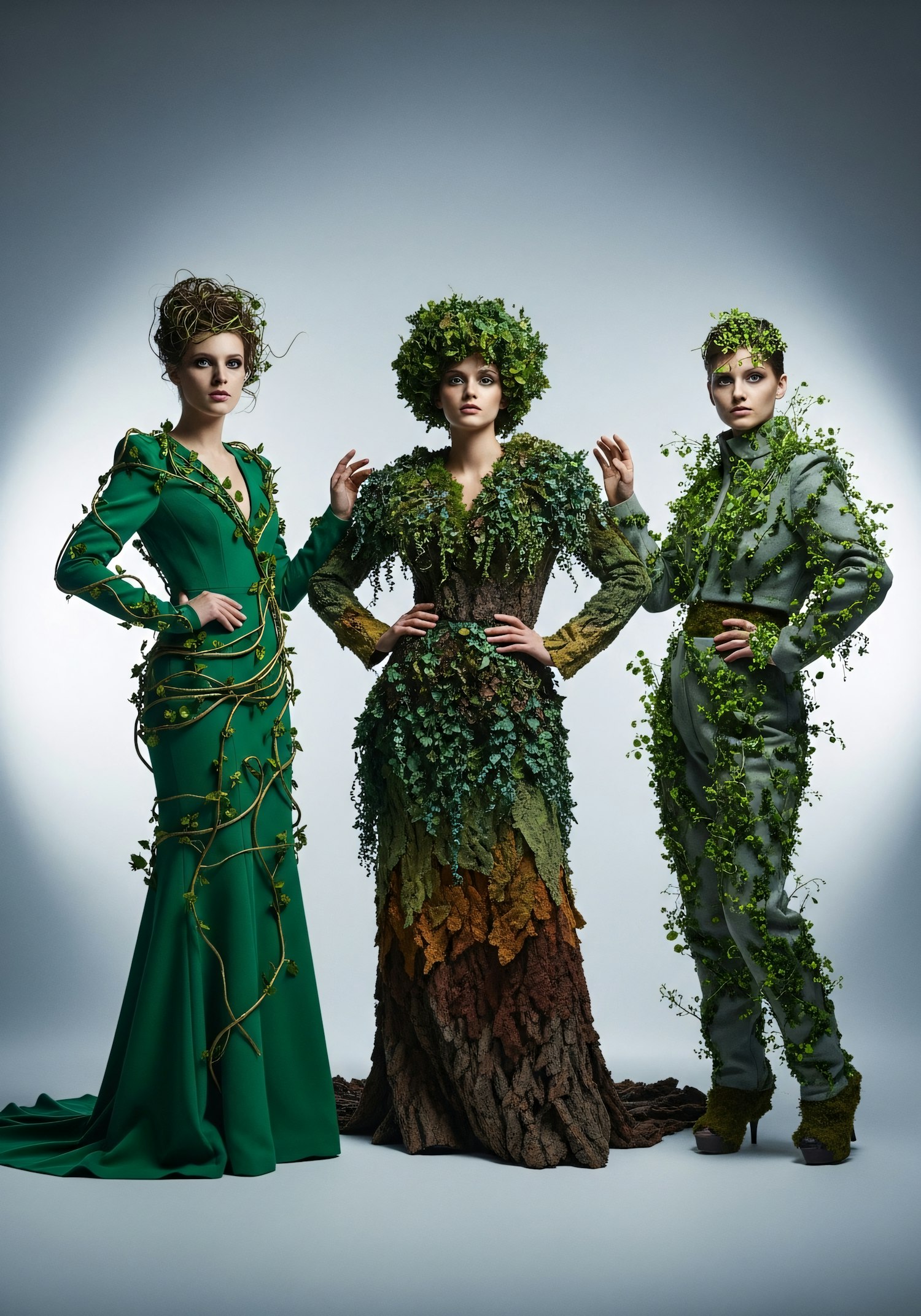 Three individuals in nature-inspired costumes, featuring vines, leaves, and tree-like textures, set against a neutral background.
